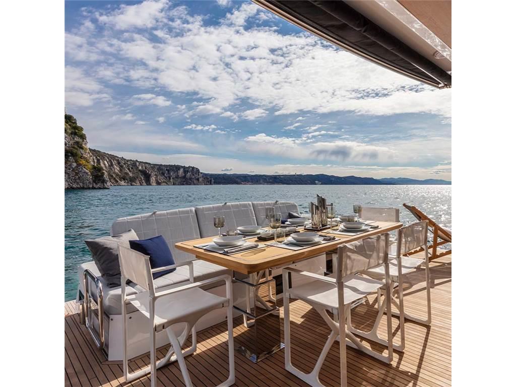 Ancora, Autogonfiabile, Elica di prua - bow thruster, Passerella, Piattaforma, Porta ingresso, Pozzetto Teak, Presa 220V banchina, Presa acqua banchina, Salpa Ancore Elettrico, Scaletta da bagno, Stabilizzatori, Tavolo pozzetto, Tromba, Winch.