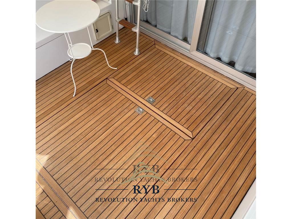Doccia esterna, Doppia timoneria, Elica di prua - bow thruster, Faro orientabile, Flap idraulici (N°2), Luci di cortesia, Passerella, Piattaforma, Pompa di sentina manuale, Porta ingresso, Pozzetto Teak, Presa 220V banchina, Ripetitore strumentazione, Rollbar, Salpa Ancore Elettrico, Scaletta da bagno, Tromba.