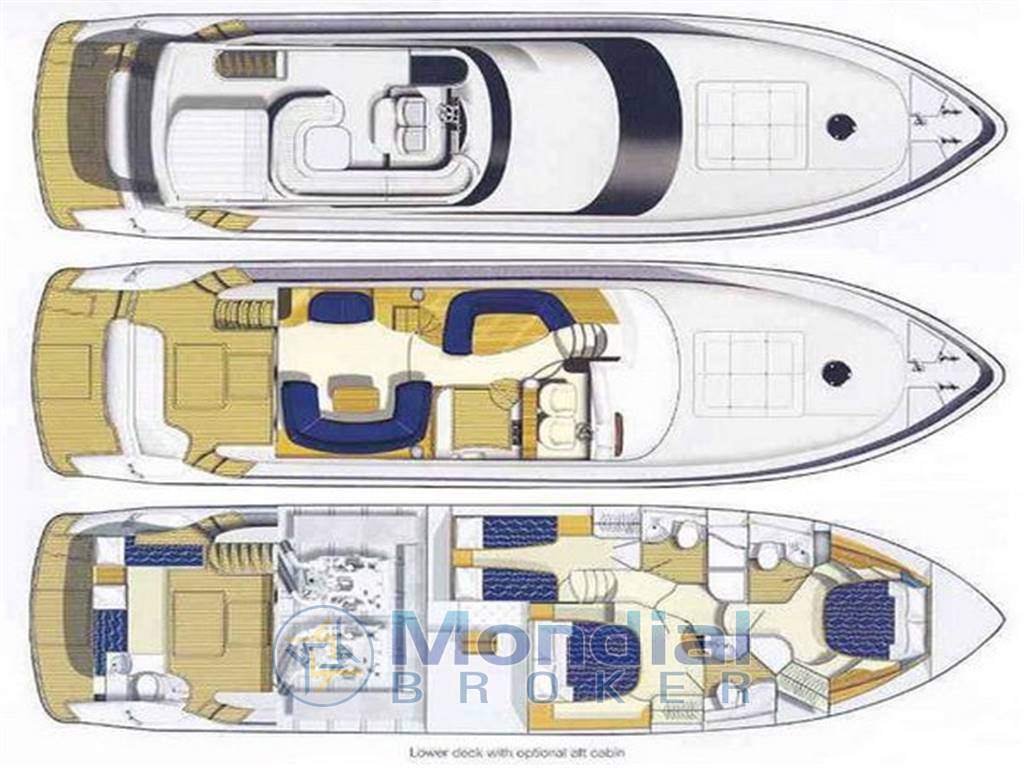 Verricello elettr. Passerella idr. Elica di prua ,Elica di poppa, angolo di barra, Aria condizionata, Riscaldamento. Generatore 18 KW, Dissalatore, Fabbricatore del ghiaccio, boiler, impianto banchina , carica batterie, impianto acque nere, Luci subacquee, cucina esterna e frigo sul fly ,teak in pozzetto, cuscieria di poppa, cuscineria di prua, cuscineria fly,