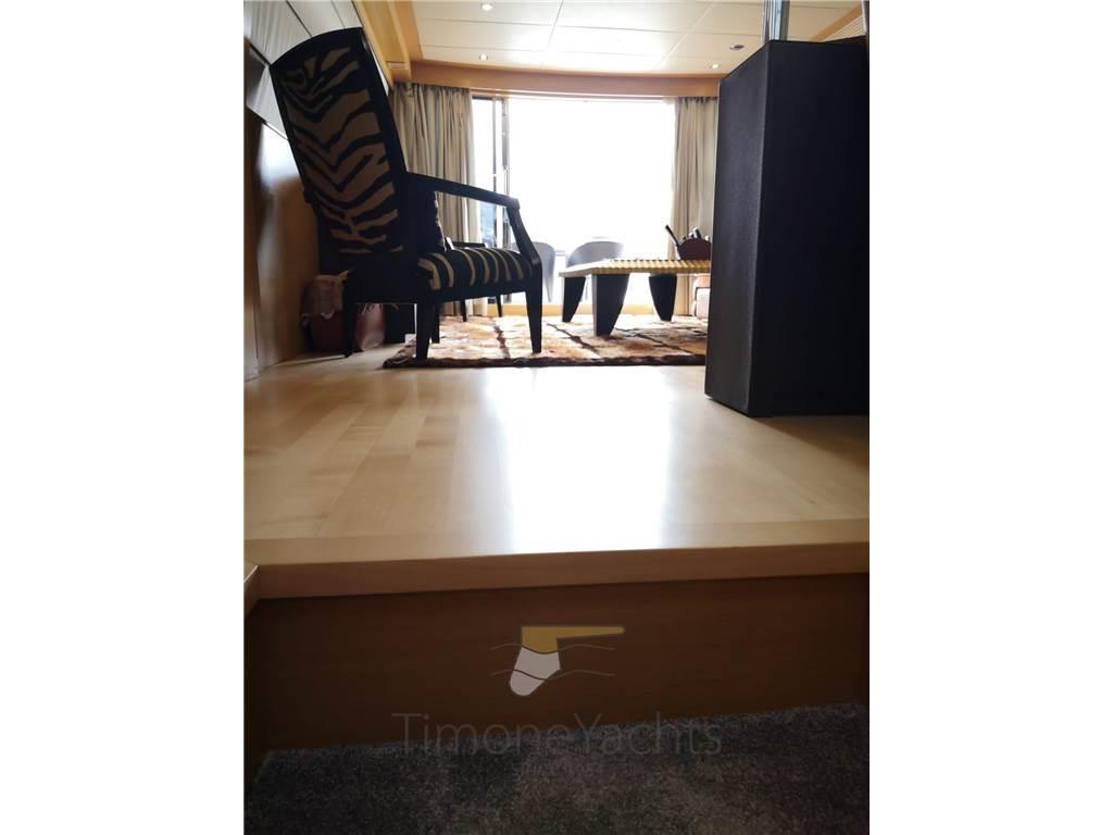 Ingresso dal pozzetto in un salottino arredato con grande estro che anticipa la zona guida, molto minimal e funzionale. Si sende al mezzanino che rivela una cucina magnifica ed una zona dining interna di grande gusto. Tre cabine ospiti magnifiche, matrimoniali e con bagno en suite. Zona crew a prua con doppio letto e servizi.
