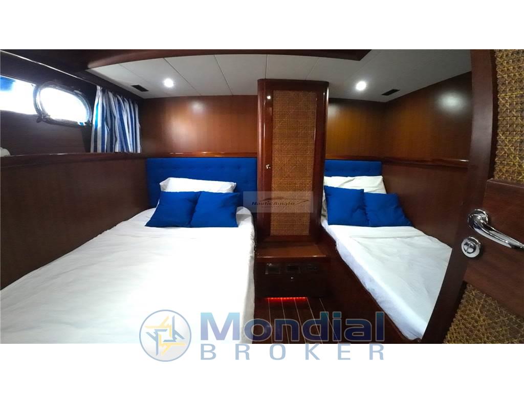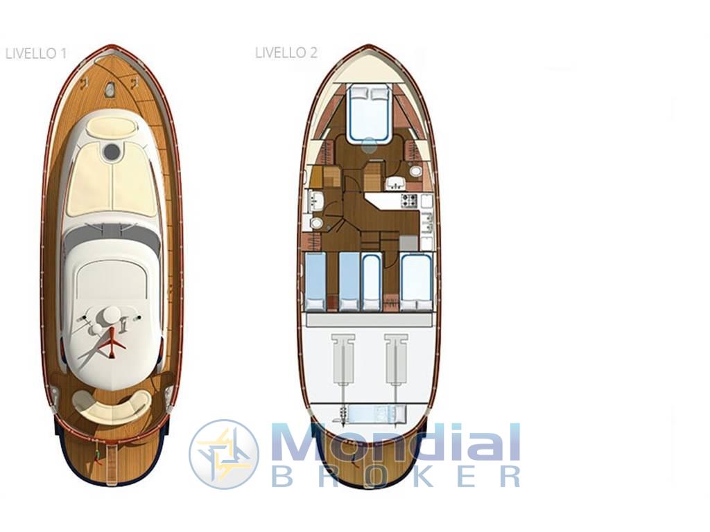 1 Matrimoniale italiana, 1 Doppia in piano, 1 Tripla, 1 Cabina equipaggio, 1 Dinette, 1 Cucina, 2 Toilette doccia no bidet