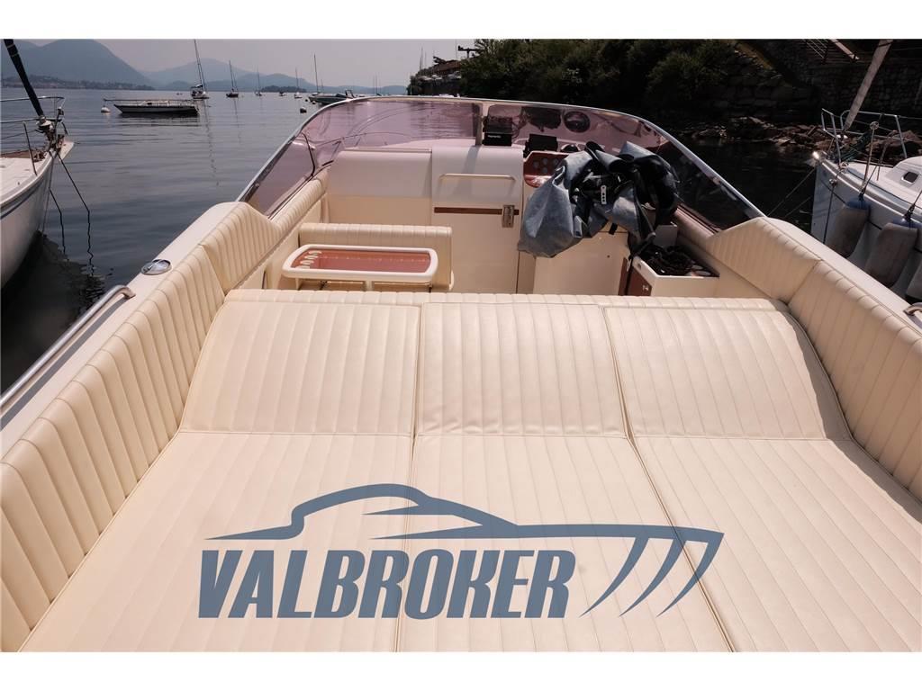Copripozzetto (nuovo sunbrella), Cuscineria di prua, Fornello (2 Fuochi), Frigorifero esterno, Stereo, Tendalino (2024), WC marino elettrico, Lavori eseguiti 2024: smontaggio girante, cinghie e puleggia pompa acqua destra; smontate cannette pistone alza portellone motori, sostituito paraolio piede, cuffie crociere e perno da sterzo, rettificate eliche e bilanciate, sostituito tubo gas, sostituiti cavi cambio e acceleratore e nuova centralina elettronica. Sostituzione cristalli liquidi contatore motori, faro navigazione notturna in acciaio.