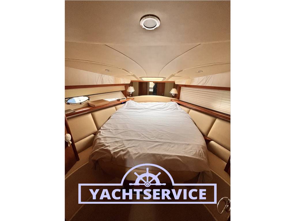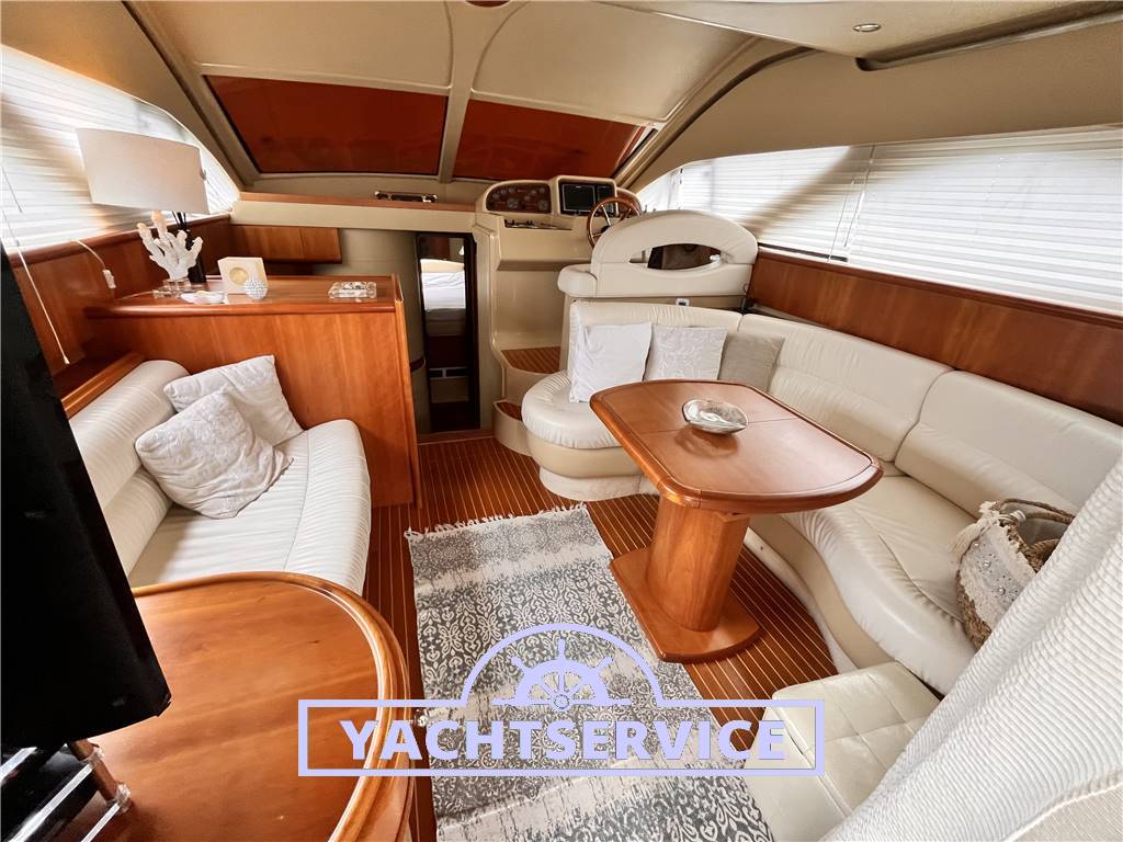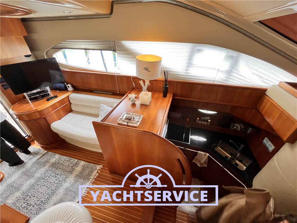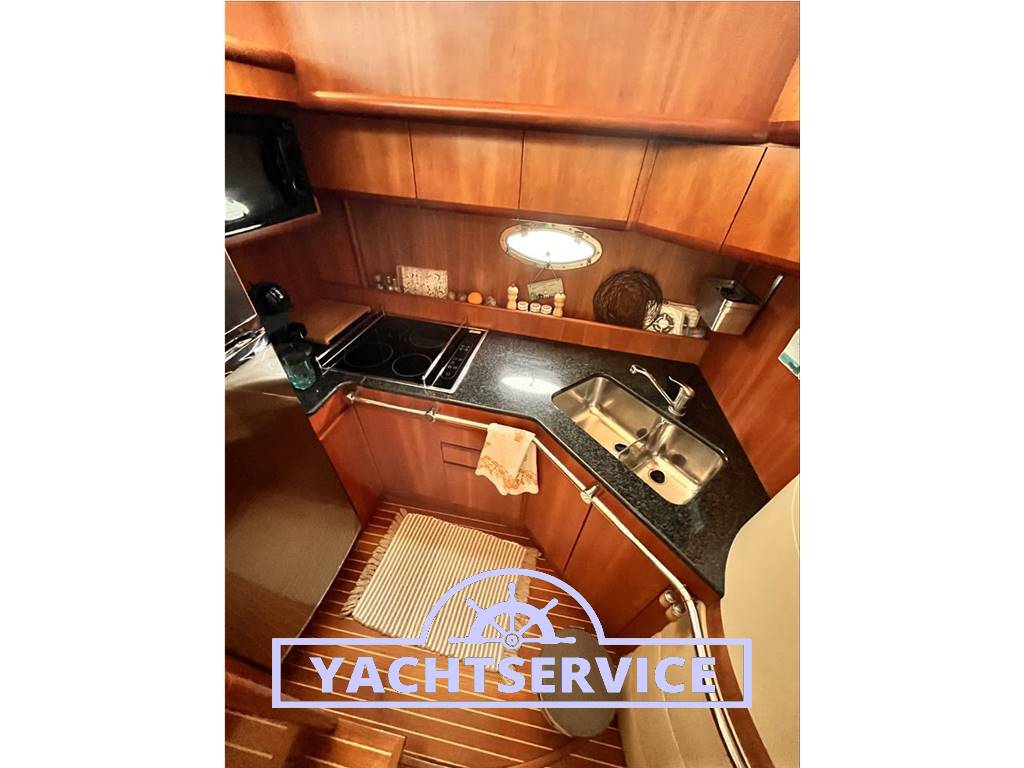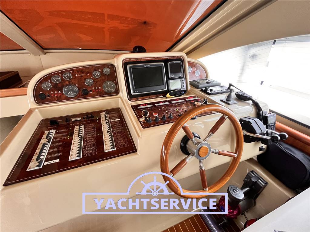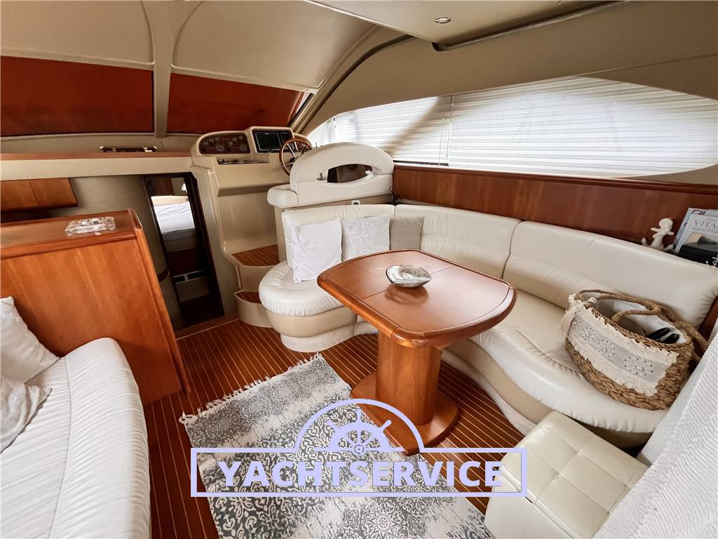 Pozzetto e plancetta di poppa in teak, passerella idraulica, calpestio interno tutto teak filettato acero bianco e mobilio in cìliegio satinato, doppia dinette in pelle bianca, strumentazione elettronica Raymarine nuova, completa anche di radar ed elica di prua. Mobili interni in ciliegio satinato.