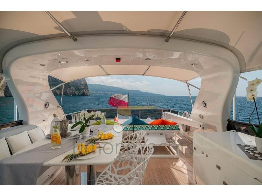 Aria condizionata, BBQ/ Grill, Clima reversibile, Dimmer per Luci, Dissalatore (2022 150 Lt / h), Impianto acque nere, Pavimento interno in legno, Prese interne 12v, Serbatoio Acque Nere, 5 WC marino elettrico (+ crew).