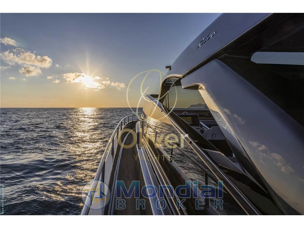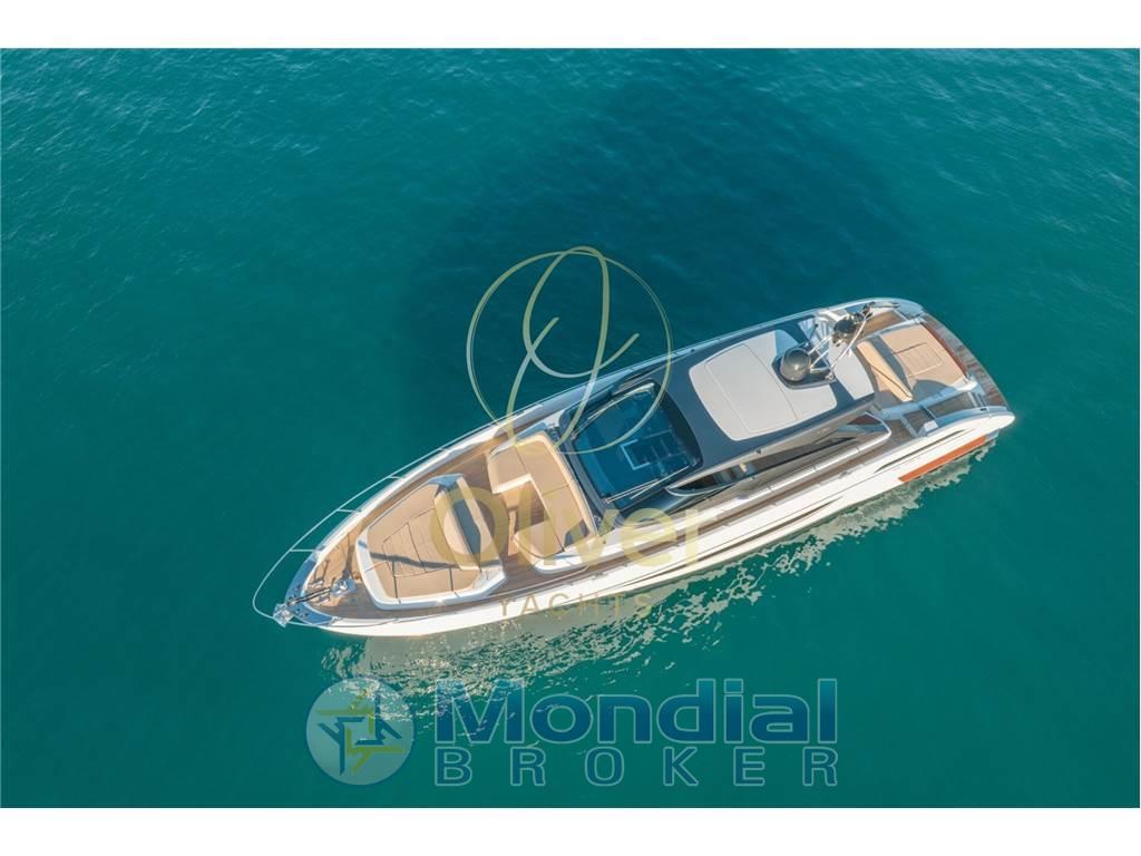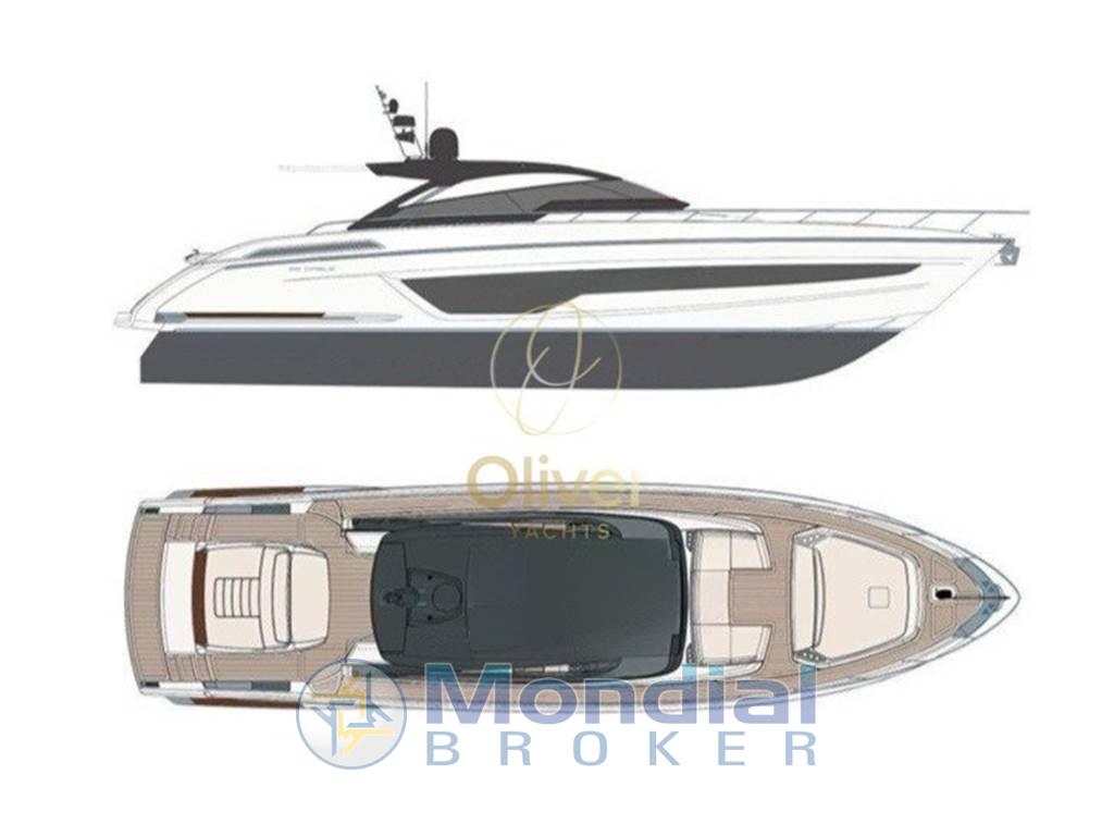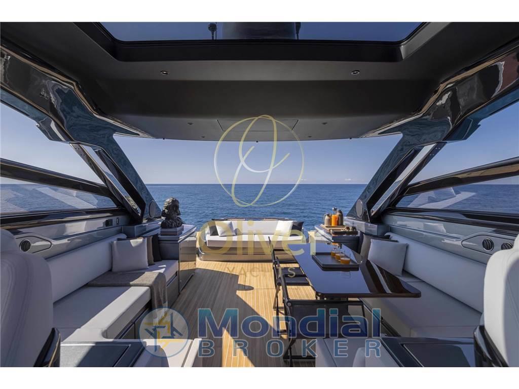 La distribuzione degli spazi esterni privilegia la vivibilità durante le uscite giornaliere e le crociere brevi, mantenendo al tempo stesso un livello costruttivo coerente con la tradizione Riva: finiture curate, materiali selezionati e attenzione ai dettagli tecnici. È una proposta orientata a un armatore che ricerca un open performante, ben costruito e riconoscibile nel design.