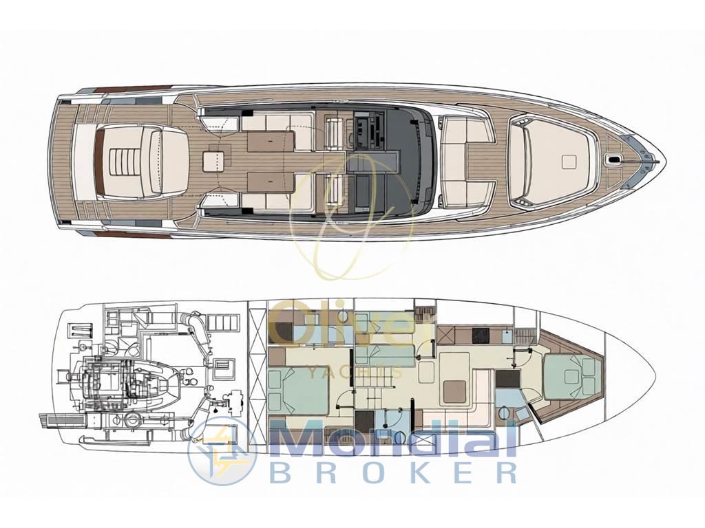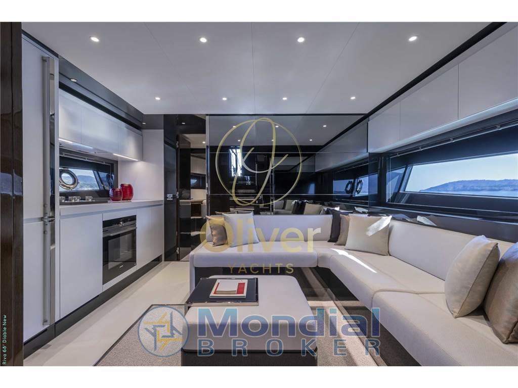Gli interni del Riva 68’ Diable riflettono un’impostazione moderna e funzionale, con un layout studiato per garantire comfort in crociera. Il salone principale, posizionato sul ponte inferiore, è luminoso e ben organizzato, con dinette e zona relax integrate in uno spazio lineare e facilmente fruibile.