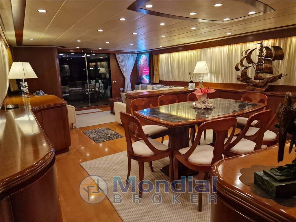 Ampio e Lussuoso salone in mogano in finitura a vernice Cabina armatoriale con doppi servizi dedicati, due camere ospiti con 4 letti singoli e bagni dedicati con doccia chiusa Cabina Vip con letto matrimoniale e bagno dedcato con doccia chiusa Cabina ecquipaggio con due letti singoli e bagno con doccia dedicato, cabina ecquipaggio con letto singolo. ampia cucina provvista di tutti gli elettrodomestici necessari