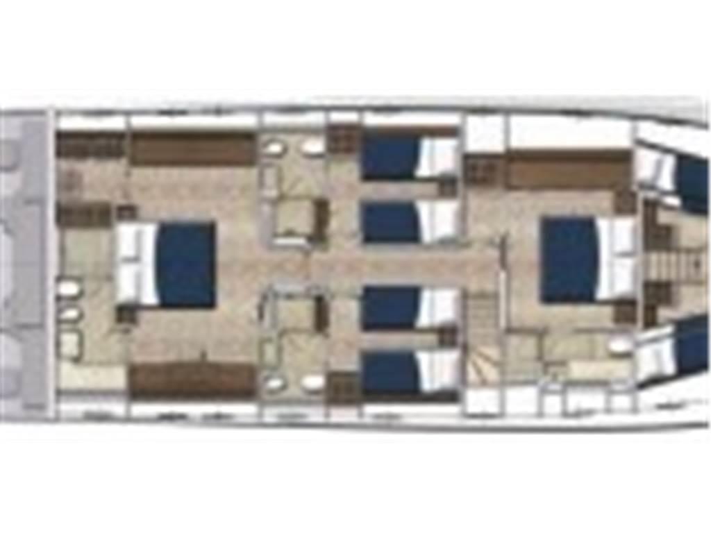 2 Doppia in piano, 2 Matrimoniale italiana, 2 Doppia letti a castello, 2 Cabina equipaggio, 6 Toilette.