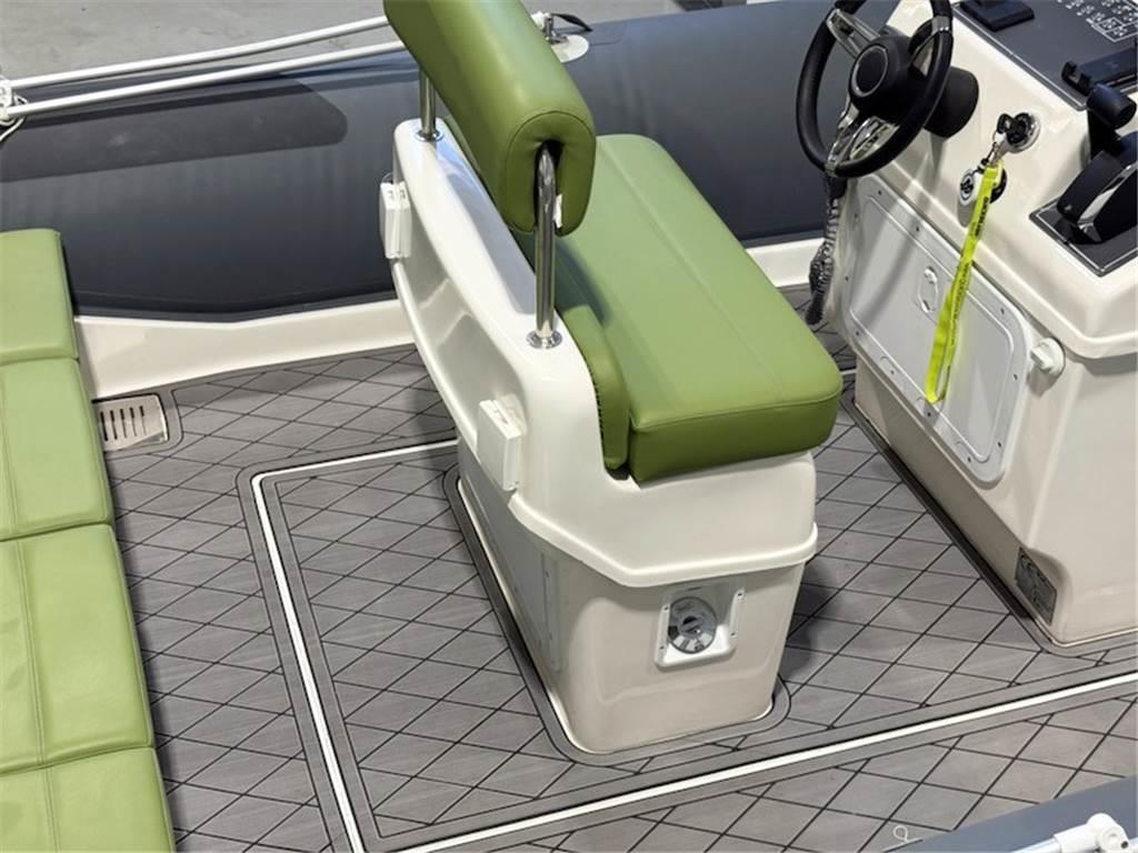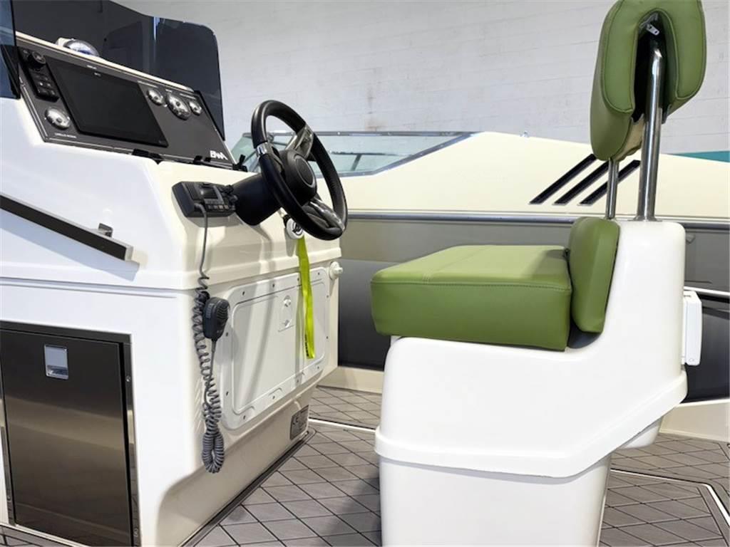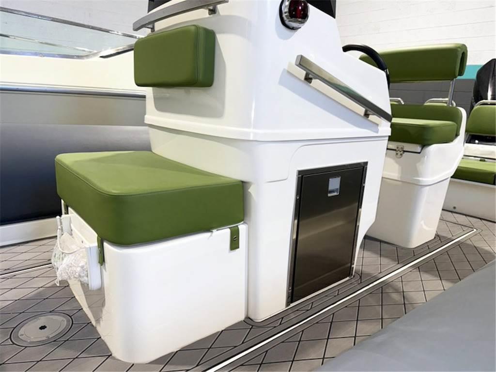 Attraverso le 2 plancette poppiere si accede al pozzetto caratterizzato da un divanetto con 4 sedute posizionato sullo specchio di poppa mentre proseguendo verso prua vi è la postazione di comando con la timoneria e la seduta per pilota e copilota.