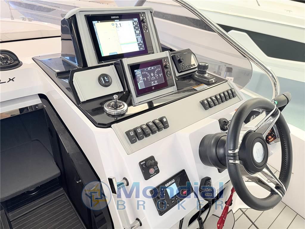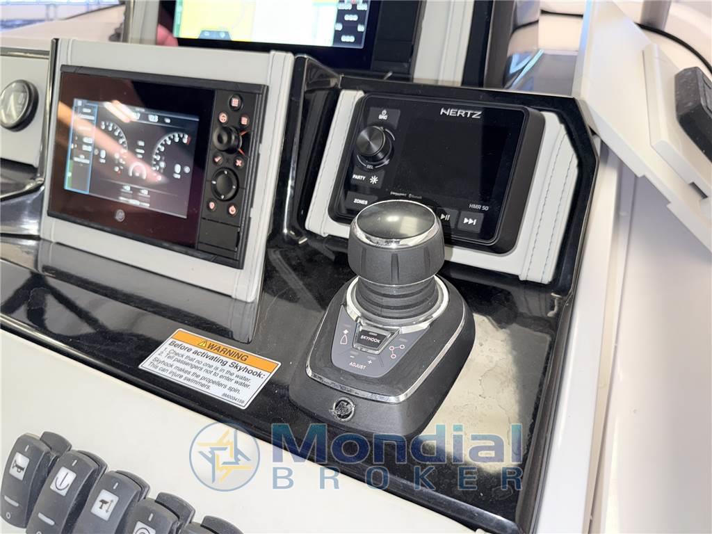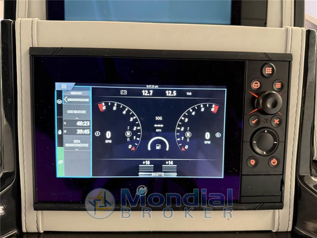 Allarme motore, Ancora, Autoclave, Batterie, Bussola, Caricabatterie, Doccia esterna, Ecoscandaglio, Elica di prua - bow thruster, Flap elettrici, Joystick, Lavandino nel Pozzetto, Luci di cortesia, Piattaforma, Pilota automatico, Plotter con antenna GPS, Pompa di sentina elettrica, Presa 220V banchina, Salpa Ancore Elettrico, Scaletta da bagno, Sistema di posizionamento dinamico, Tavolo pozzetto, Tromba, T-Top