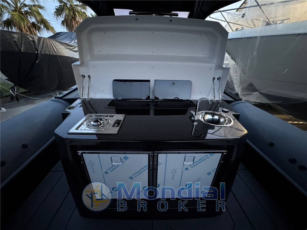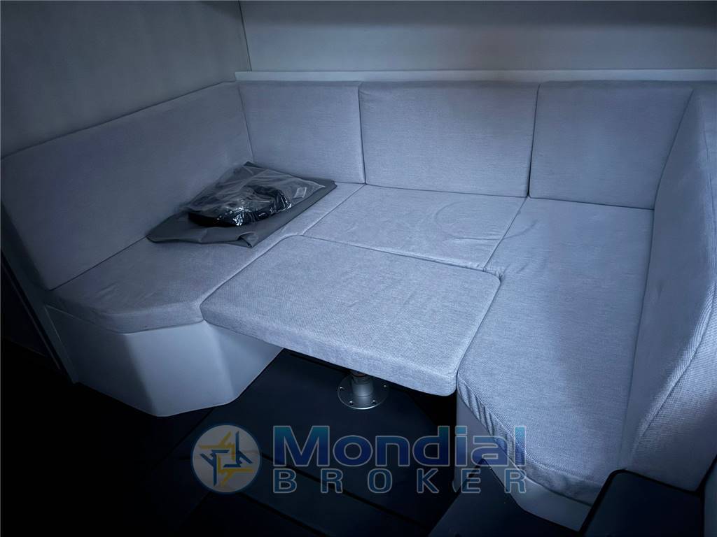 La postazione di guida integra una cucina funzionale e ben organizzata, completa di fornello, lavello e piano di lavoro, ideale per vivere la barca in totale autonomia. A poppa si trova una elegante dinette a “U” con tavolo elettrico, trasformabile in un comodo prendisole. Questa soluzione si distingue per la perfetta integrazione del tavolo con il piano di calpestio, creando una superficie continua e un’ampia area dedicata al relax e all’intrattenimento. L’Hard-Top contribuisce a rendere l’esperienza ancora più piacevole, offrendo protezione dal sole e dal vento sia durante la navigazione sia durante le soste in rada.