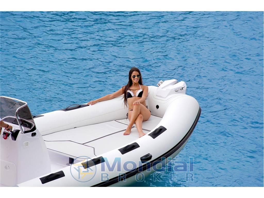 Aspiratore gas - 4 bitte inox - Consolle completa - Cruscotto "Luxury" - Cuscineria completa a cellule chiuse - Cuscini prendisole prua - Ganci traino e ormeggio - Gavone ancora in controstampata - Gavone poppa per gli accessori di ormeggio - Gavoni di prua a prendisole in controstampata - Gavone stand up guida con sportello - Gavone consolle guida con sportello - Gonfiatore manuale - Impianto elettrico completo - Luci navigazione - Musone in vetroresina a prua - Pannello elettrico con pulsantiera - Plancette poppa vtr e scala telescopica - Pompa di sentina automatica con impianto - Prolunga prendisole di prua - Schienale seduta poppa ribaltabile - Sedile fronte consolle - Staccabatteria - Stand up di guida con lavello - Serbatoio carburante polietilene reticolato - Tavolo di poppa in teak / King Starboard - Timoneria idraulica completa - Tromba elettrica - Tubolari bicolore black/white