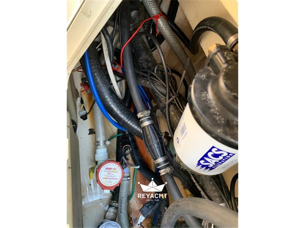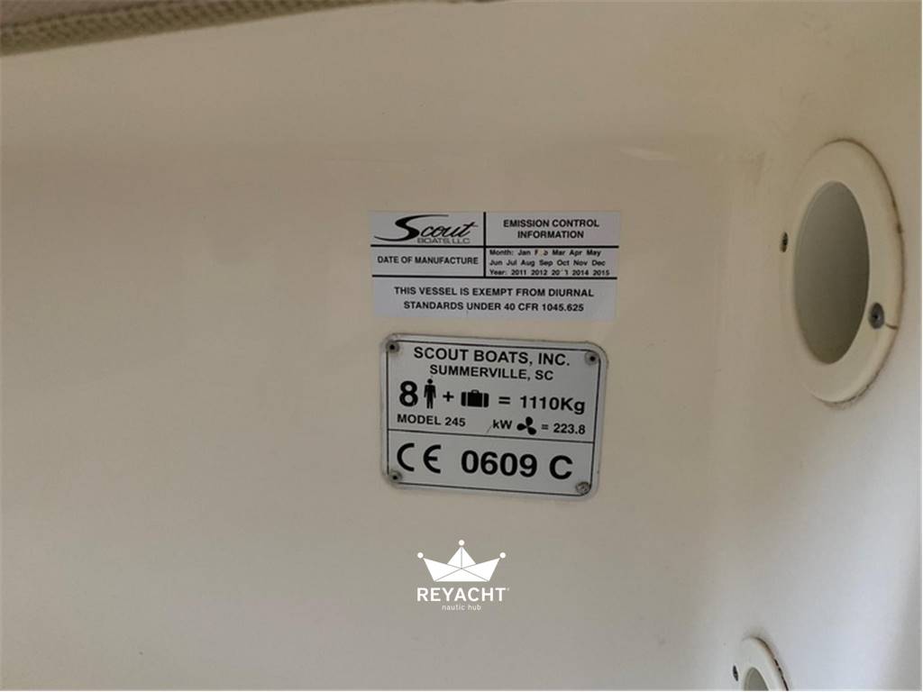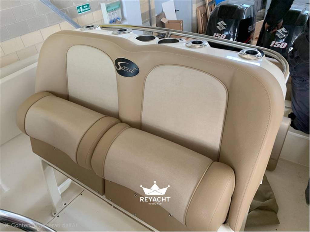 Original Scout fiberglass T-Top with aluminum uprights and side handrails. Deluxe leaning post with reclining helm seats, forward console seat and aft seat, all with full cushioning. Two round livewells with recirculation on the transom, bow pulpit with Bruce anchor and electric windlass (controls at helm and foot switch). 1.60 m high cabinet for head or storage, bilge pumps, and 6 rod holders on the gunwales. Spacious storage lockers: 2 side, 1 floor center, 1 flip-up bow with table for anchor access, 1 cooler under forward console seat, 1 behind leaning post. 2023 Lenco trim tabs, hydraulic steering, and electronic throttle.