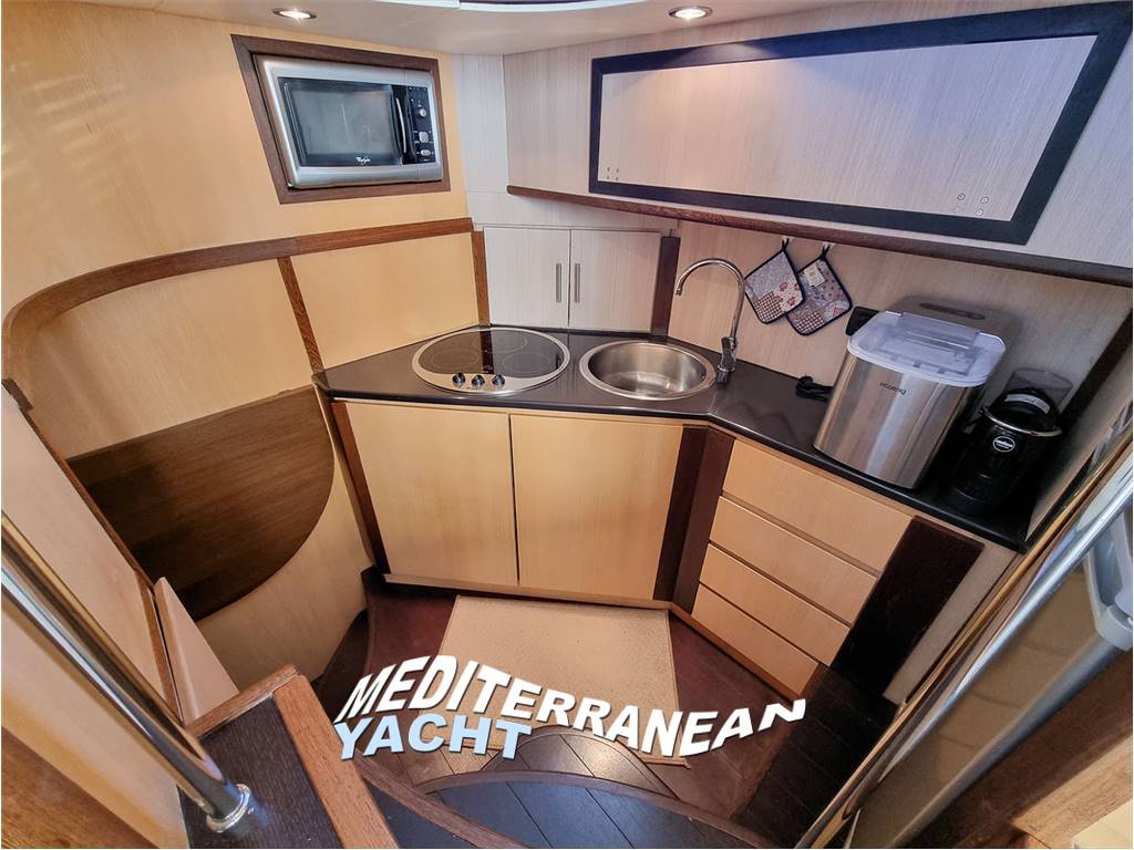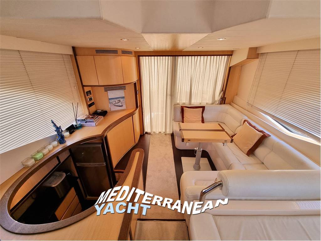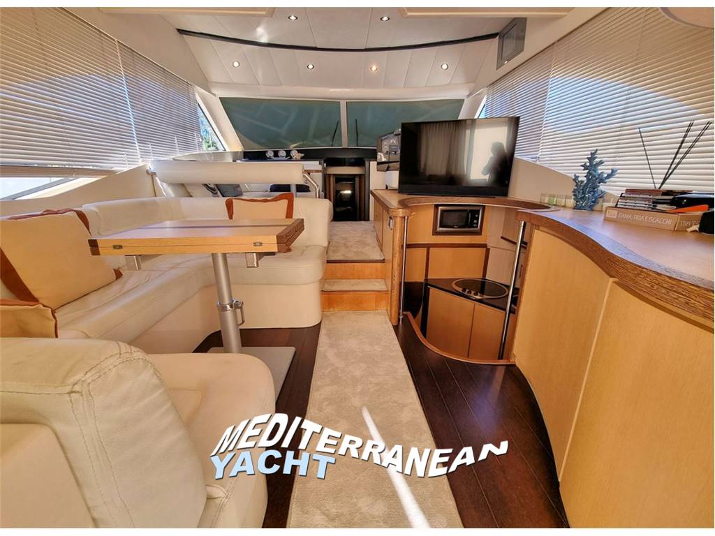 - Salone con divano a "C" e tavolo ampliabile, mobile contrapposto; cucina in basso DX con piano cottura in vetroceramica, frigo/freezer a colonna, forno microonde e lavello; dinette lato SX con divano a "C" e tavolo, timoneria contrapposta, scala discesa alle cabine