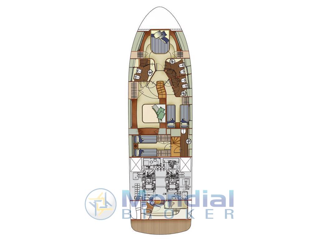 Cabina armatoriale a tutto baglio, cabina vip, 2 canine ospiti doppie in piano con terzo letto pullman, 4 toilettes con relative docce, dinette, salone, cucina, cabina equipaggio con toilette.