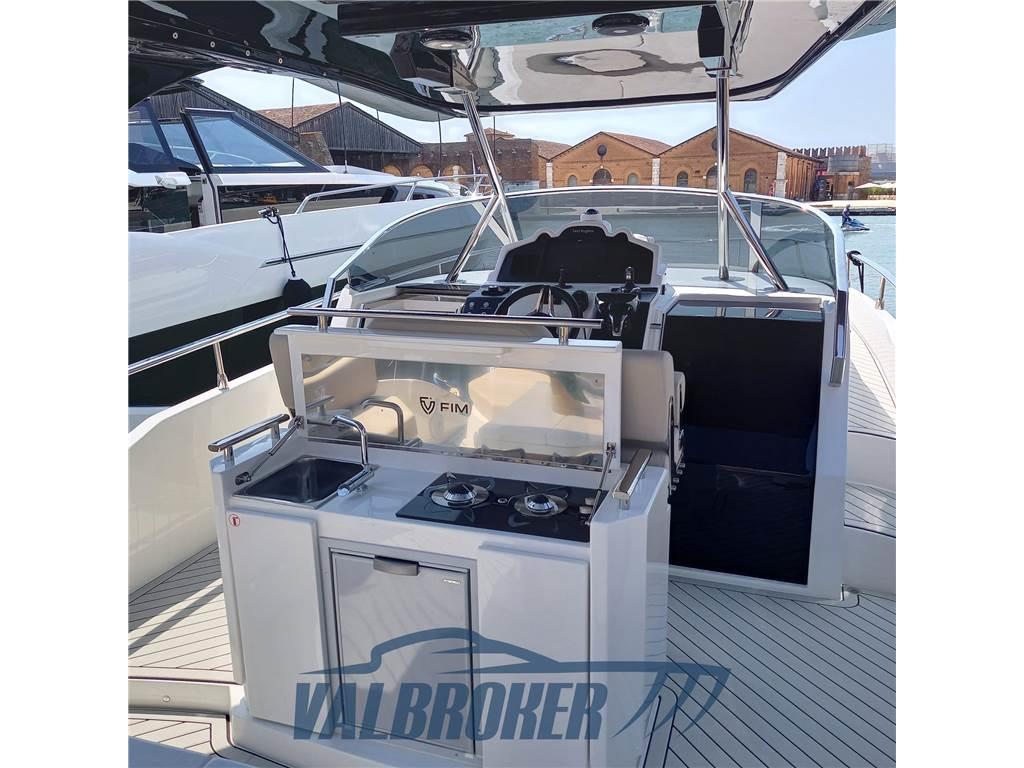 4 Altoparlanti, Aria condizionata (7k BTU), Boiler (elettrico bivalente), Cuscineria di poppa (prendisole con movimentazione XL (guide scorrevoli, schienale ribaltabile, cuscino per tavolo)), Cuscineria di prua, Fornello (esterno 2 fuochi), Frigorifero interno (65 l), Stereo (Fusion upgrade), Tendalino (prendisole con pali in carbonio), TV (24''), Cruscotto con effetto in carbonio, correttori di assetto Zipwake Dynamic Trim System, predisposizione generatore, passauomo apribile a prua, chiusura parabrezza su 3 lati, telo copri cuscineria, kit cuscini per trasformazione dinette prua e poppa