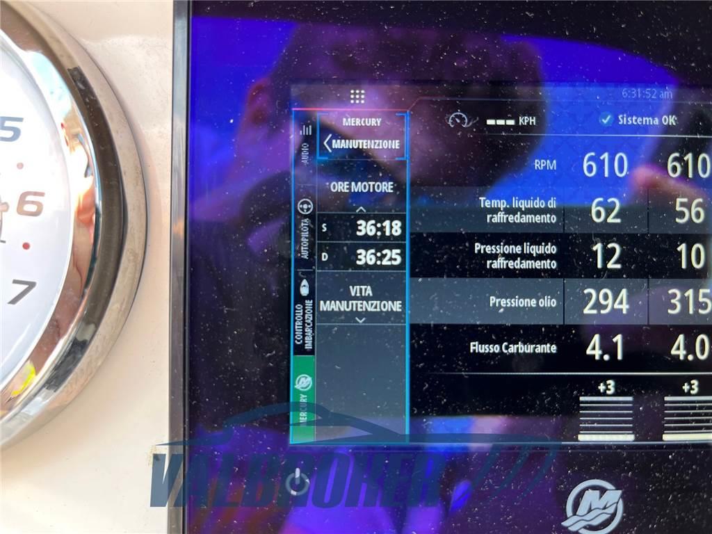 Apertura Vano Motore Elettrica, Autoclave, Batterie, Bussola, Caricabatterie, Computer di bordo (Mercury), Contamiglia, Doccia esterna, Ecoscandaglio (con trasduttore), Elica di prua - bow thruster, Garage per tender, GPS (Raymarine “Axiom 9”), Indicatori Flaps (Lenco), Joystick, Lavandino nel Pozzetto, Log, Luci di cortesia, Luci subacquee, Piattaforma (teak), Pompa di sentina elettrica, Pozzetto Teak, Salpa Ancore Elettrico, Scaletta da bagno (amovibile), Tavolo pozzetto (teak, amovibile)