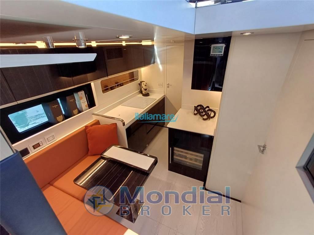 Sport boat with a wide aft cabin under the sunbathing area, featuring a dedicated second kitchen.