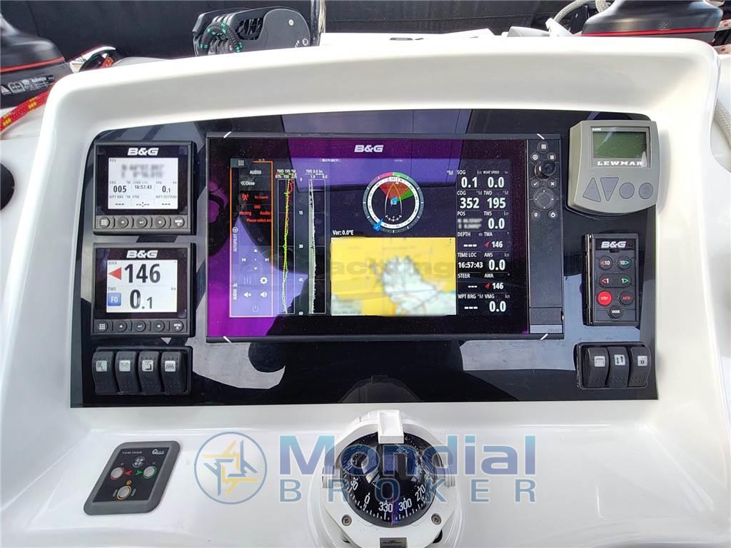 AIS (B&G), Angolo barra, Antenna radar, Bussola (Plastimo), Computer di bordo, Contametri catena, Contamiglia (B&G), 3 Display (Triton B&G), Ecoscandaglio (B&G), Log (B&G), Pilota automatico (B&G), Plotter con antenna GPS (B&G Zeus), Radar (B&G Zeus), Radio VHF (B&G), Stazione vento (B&G).