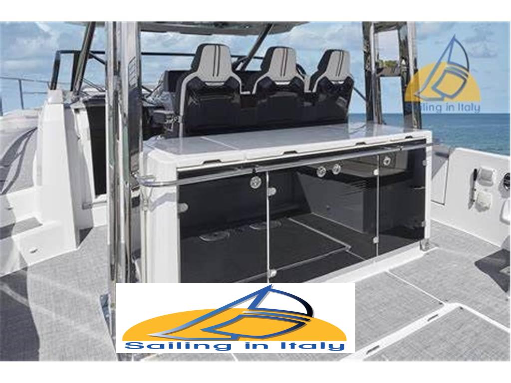 Including: T-top in acciaio inossidabile con tetto in vetro resina, Tetto apribile elettricamente, Faro orientabile, Faro di pozzetto (2 a prua / 2 a poppa),