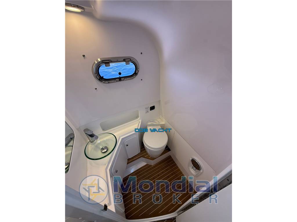 Disposizione interni ed esterni: cabina OPEN SPACE con letto a V a prua, WC separato con mobile con lavabo, ampio prendisole di poppa, divano di navigazione, seduta pilota e co pilota con mobile living con lavabo, frigo ISOTHERM CR49 con porta in acciaio e fornello CAN, ampio prendisole di prua.