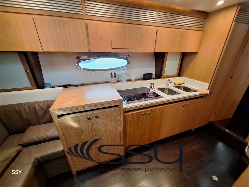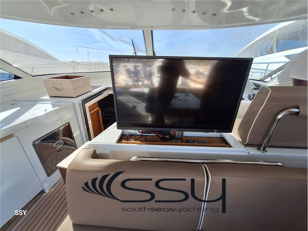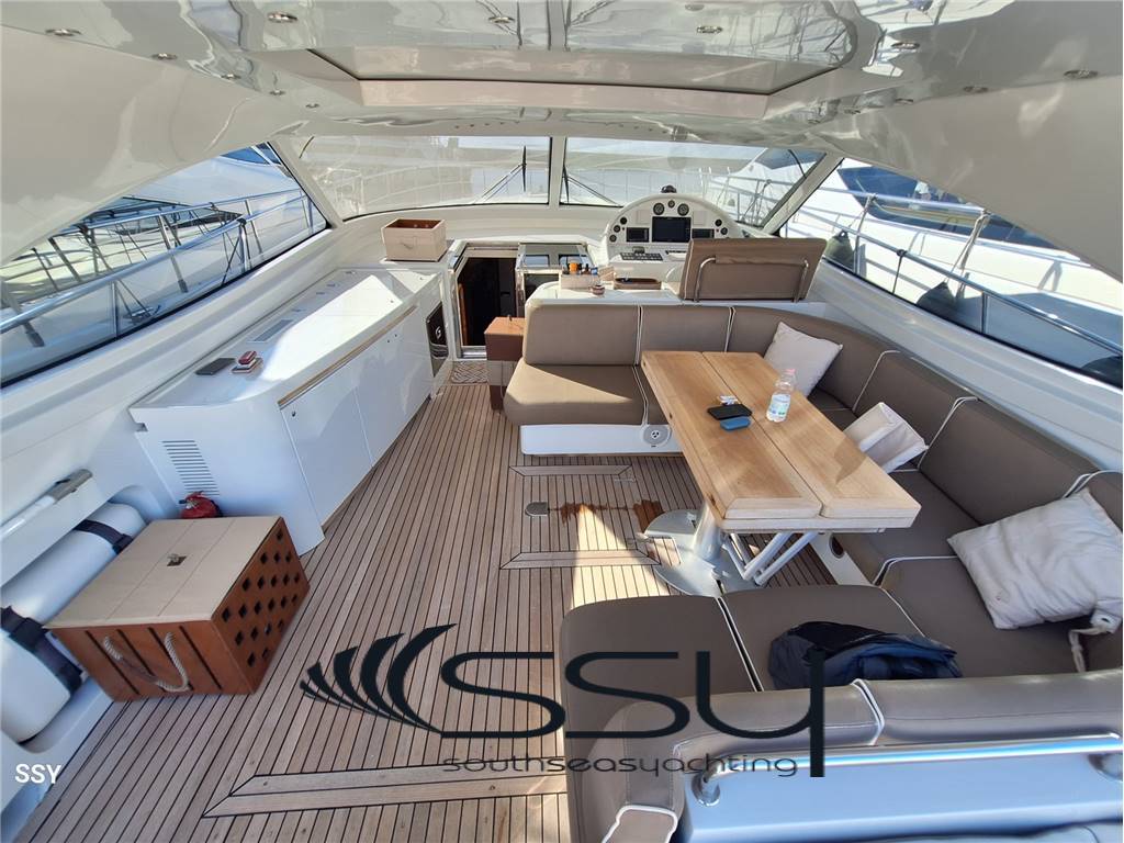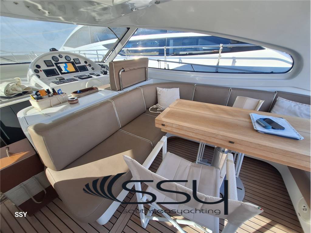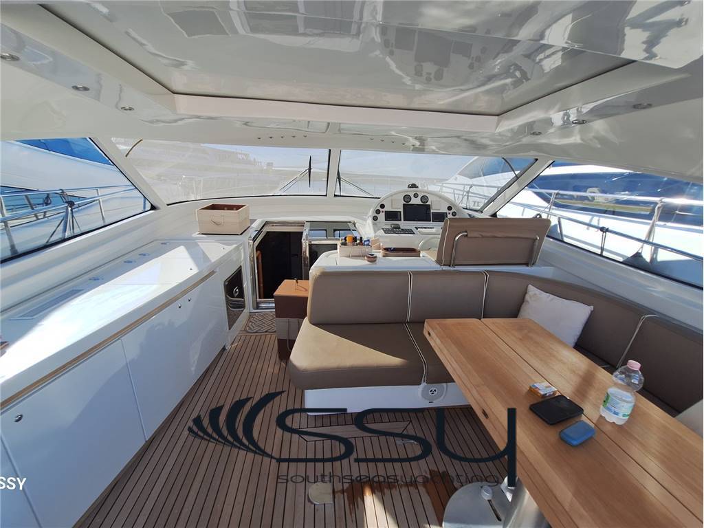 - Spacious and comfortable air-conditioned cockpit with Sunbrella sofa, extendable telescopic table, retractable Sharp Aquos Smart TV, Fusion MS-AV650 Hi-Fi system, fully equipped bar cabinet with sink, Schott glass-ceramic cooktop, and Isotherm drawer fridge;