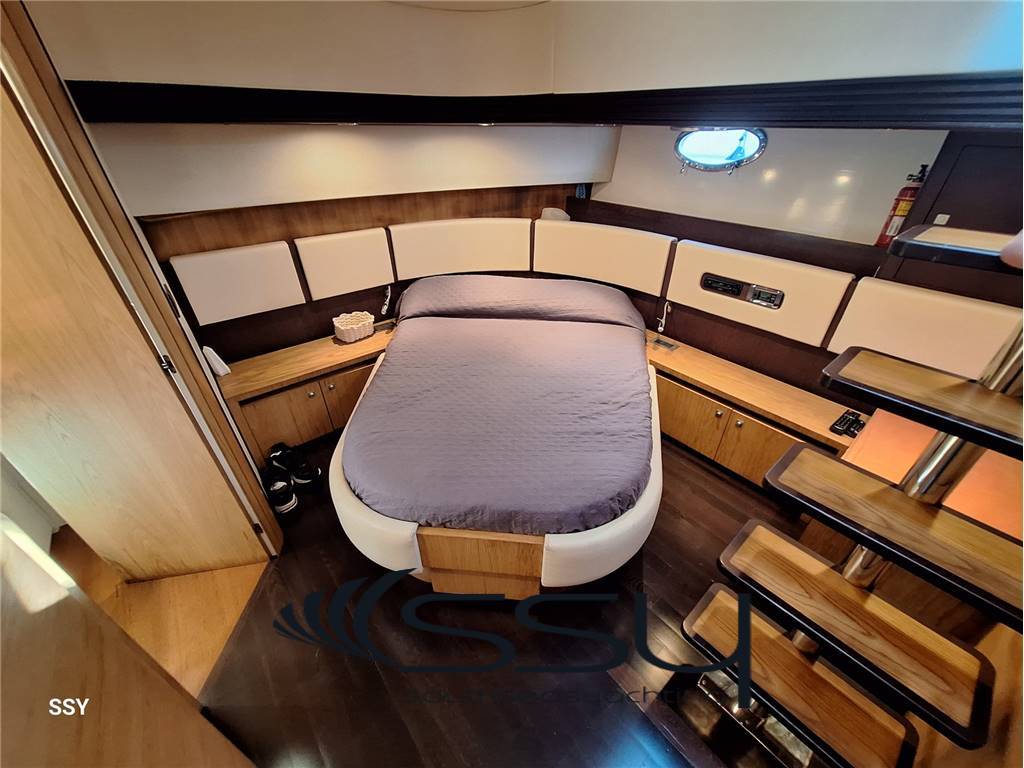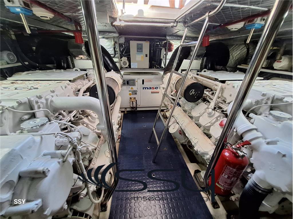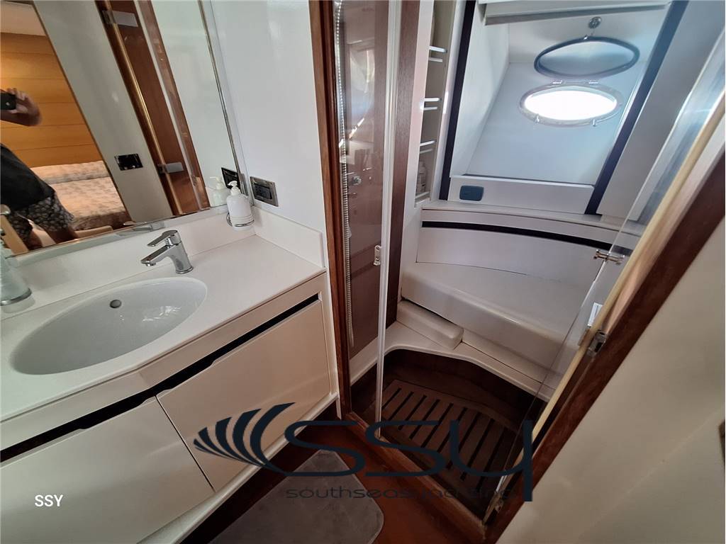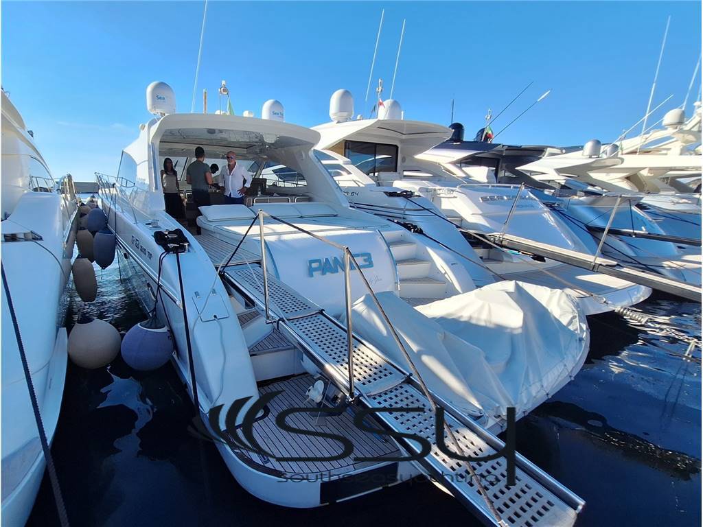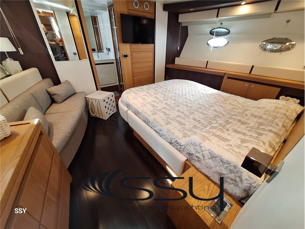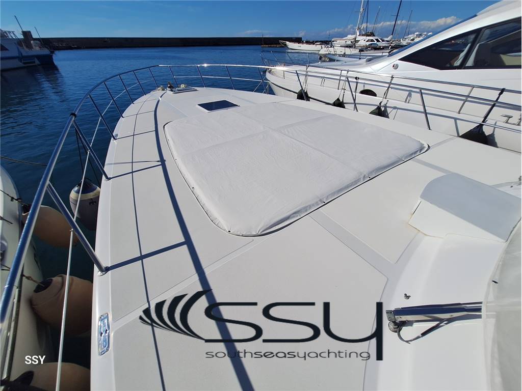 - Spacious and comfortable air-conditioned cockpit with Sunbrella sofa, extendable telescopic table, retractable Sharp Aquos Smart TV, Fusion MS-AV650 Hi-Fi system, fully equipped bar cabinet with sink, Schott glass-ceramic cooktop, and Isotherm drawer fridge;