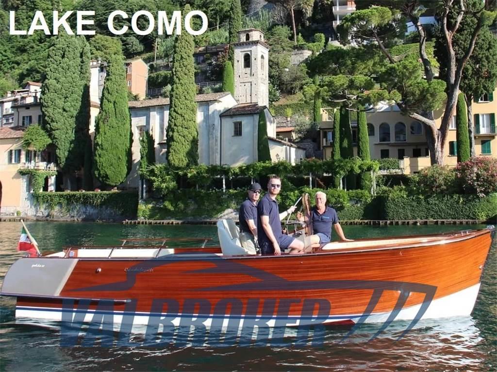IMBARCAZIONE NUOVA. Poldo 23, la barca del 70° Anniversario, costruita in mogano, rovere e iroko. Dotata di motore entrobordo diesel e trasmissione in linea d’asse. Ampio prendisole a prua, la plancia di guida con sedile ribaltabile per la guida in piedi, il vano motore centrale, le sedute di poppa con la divaneria a ‘U’ e infine la plancetta di risalita dal bagno con carabottino in teak. La cuscineria del prendisole prodiero nasconde un ampio gavone per il deposito di salvagenti e attrezzature, che all’occorrenza può diventare una cuccetta di emergenza. Vi si accede attraverso due gradini ai lati della plancia. La consolle è dotata dei classici strumenti di navigazione, tra cui il contagiri, il livello carburante, pressione olio, il contaore digitale. Due batterie da 80 Ah l’una garantiscono l’alimentazione per il motore e i servizi.