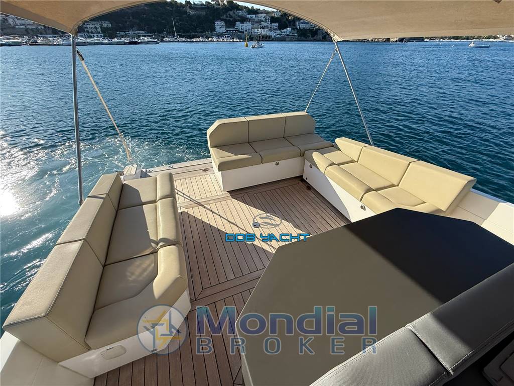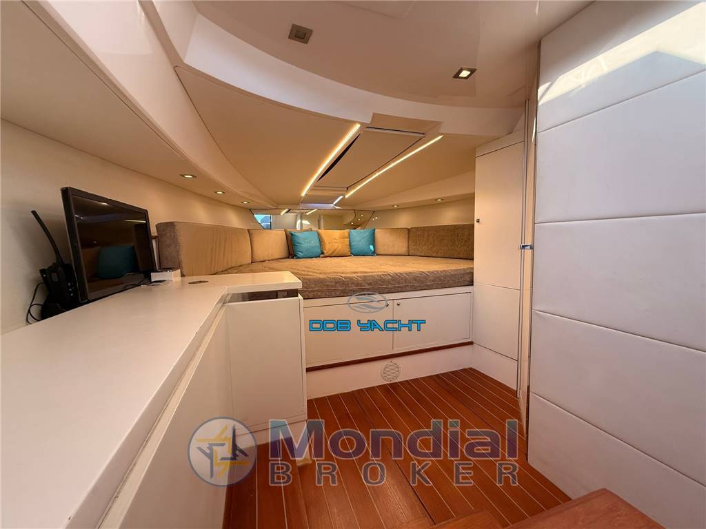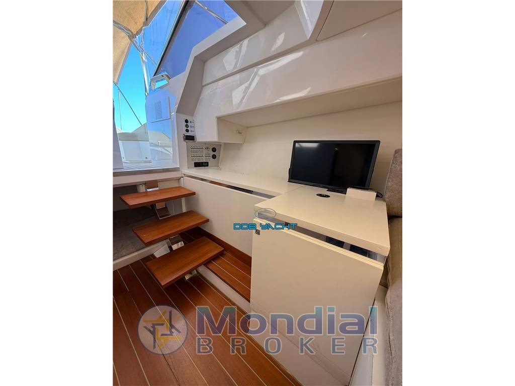 Disposizione interni ed esterni: cabina OPEN SPACE con letto a V a prua, locale wc separato, cabina di poppa open space; ampio pozzetto di poppa con divani corredati di tappezzerie complete, tavolo elettrico convertibile in prendisole, mobile living con lavandino, fuochi a gas e frigo, plancia di comando con seduta pilota e co pilota, ampio prendisole di prua.
