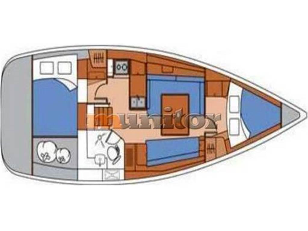 Salone, Cucina, Cabina di prua, Cabina di poppa, Bagno, WC, Pozzetto