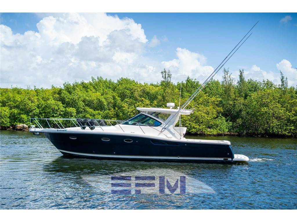 Tiara custom composite windshield frame with tempered safety glass and opening center vent • 45" swim platform with built-in ladder • hardtop with sunroof • Tiara custom diamond pattern non-skid and 2-tone exterior seating.