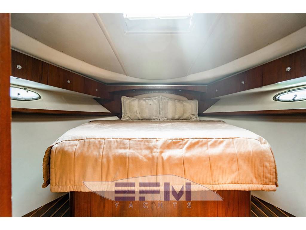 Solid-wood floors, teak-veneer cabinetry with brushed stainless-steel hardware, and a molded-fiberglass head. The portside galley features a recessed, two-burner cooktop, Corian countertops, microwave oven, coffee maker, refrigerator/freezer and storage galore. The U-shaped dinette converts into a double berth, and the backrest flips up to create a Pullman berth. The forward private master stateroom has a queen-sized island bunk with storage, hanging lockers and built-in flat-panel TV.