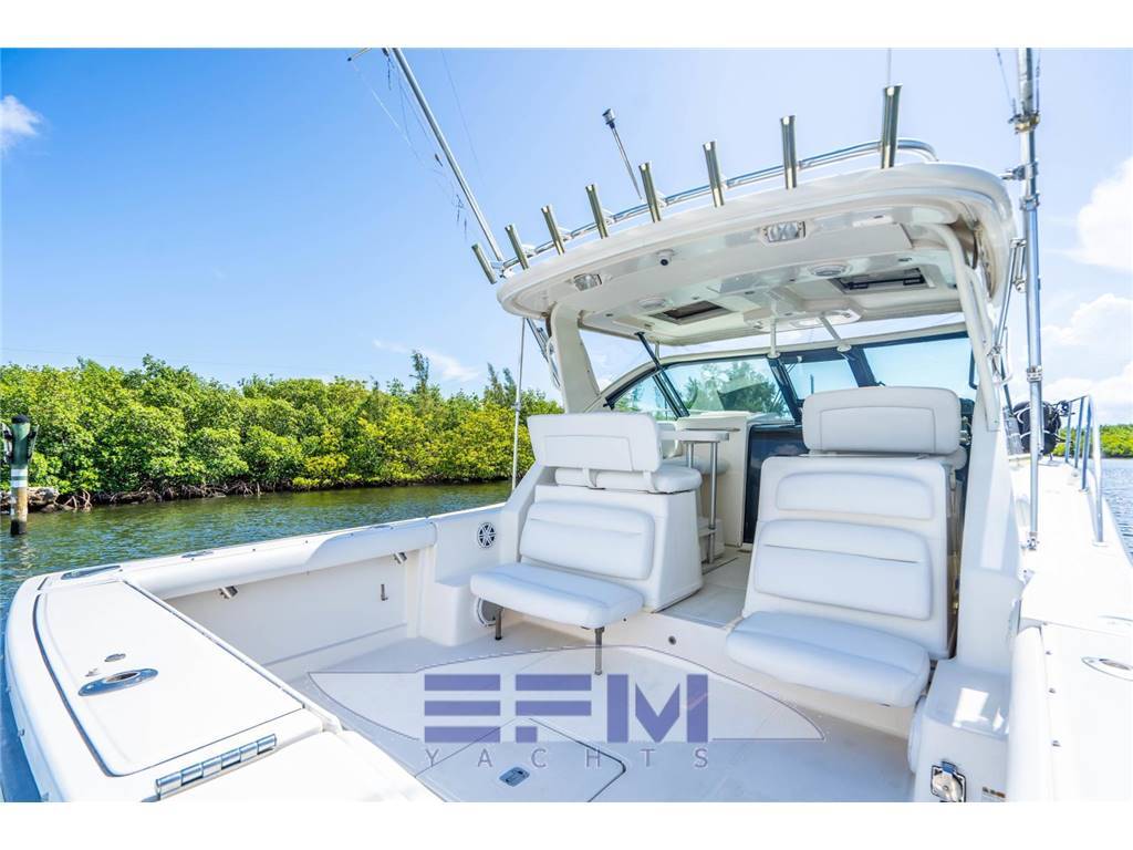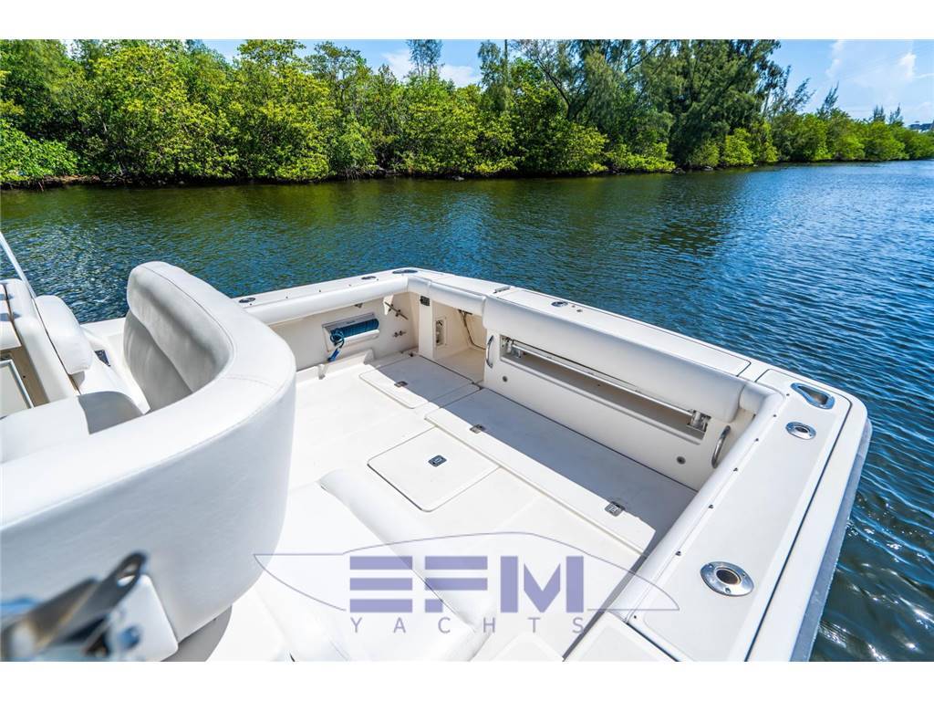 70 square feet of unobstructed cockpit space. With port and starboard aft-facing seats, two in-deck insulated fish/storage boxes, fresh and raw-water washdowns, padded coaming bolsters, cockpit shower and fold-down transom seat, and Swim Platform