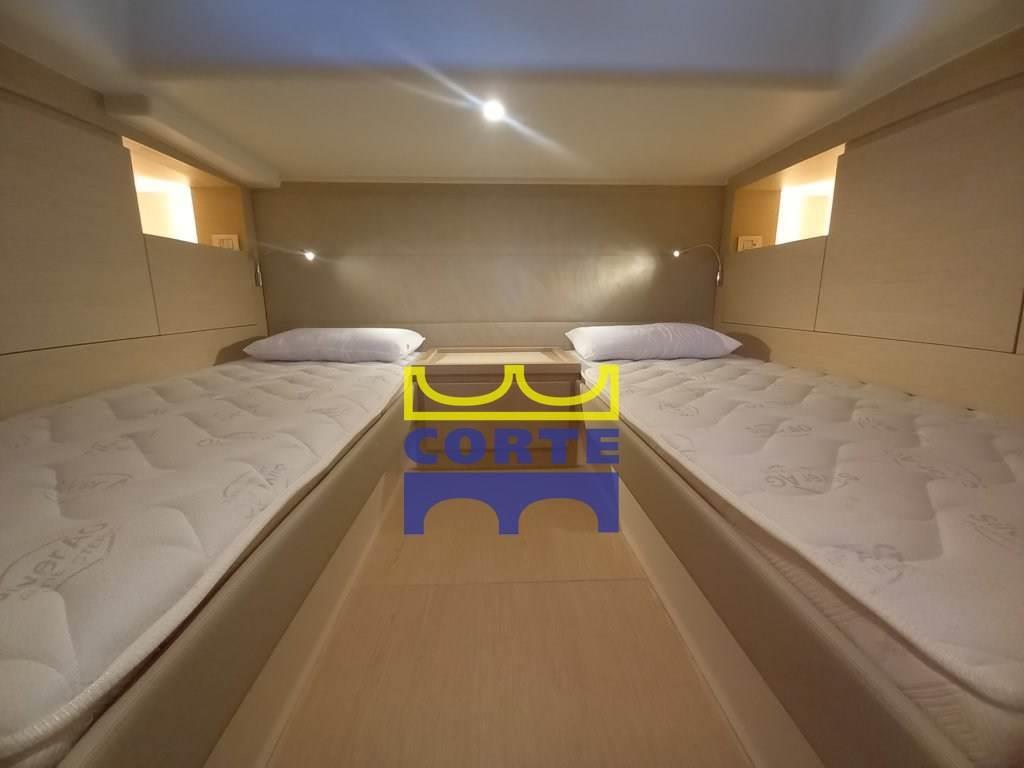 Cabina armatoriale matrimoniale. Cabina ospiti con letti in piano e porta di separazione. Bagno con doccia.