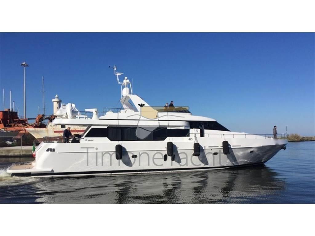 Bow thruster - Bathing ladder - Crane - Tender - Windlass - Galley - Bimini top - Bow sun cushion - Cushions - Fridge - Freezer - Oven - Microwave - Washing machine - Dish washer - Icemaker - DVD - Stereo sound system - Sat tv system - TV n° 6 - Water pump - Shore water plug - Stern mooring winch - Gangway - CD player - Manouvre Joystick - Battery charger - Fridge on fly - Sink on fly - Waste holding tank - Searchlight - Water heater - Teak platform - Teak cockpit - Crane on fly - Automatic flap - Wet bar on fly -and bar in main salon - Electric anods system (anti galvanic) - Seakeeper.