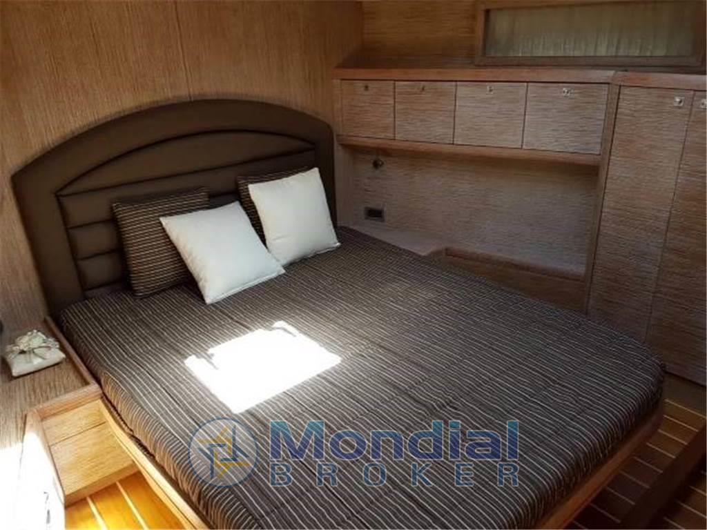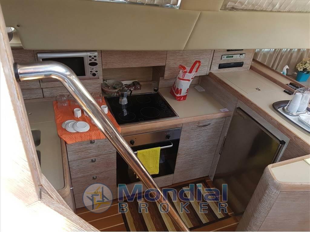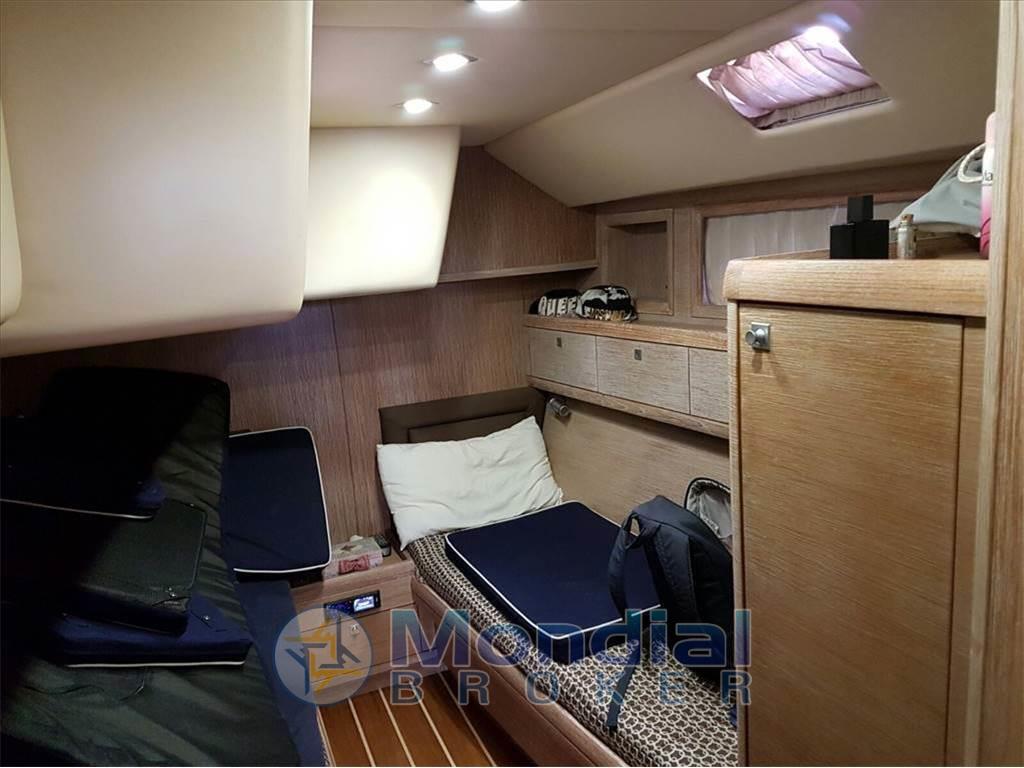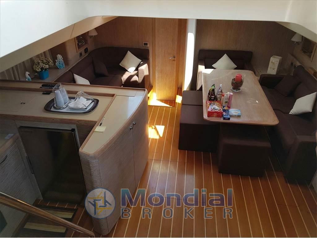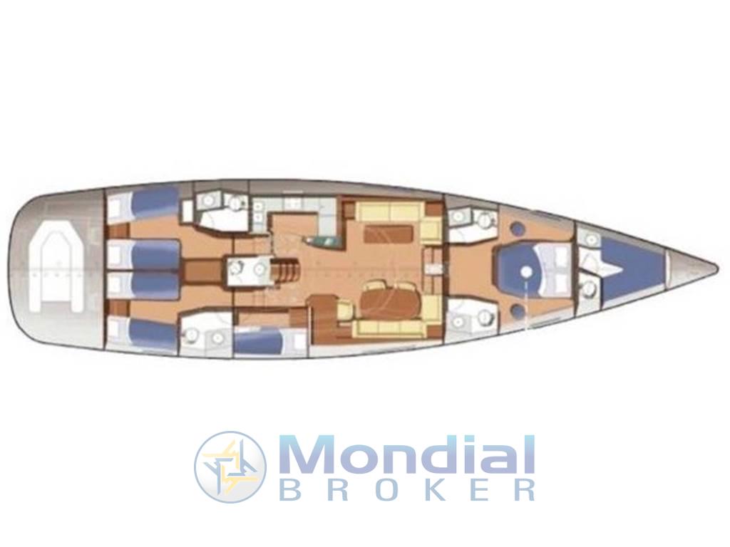 Ampio pozzetto con tavolo - dinette con divani, tavolo e cucina - tavolo e postazione carteggio - versione con cabina armatoriale con letto matrimoniale e bagno a prua - cabina ospiti con due letti in piano e bagno - cabina ospiti con due letti in piano centro barca tutte e due verso poppa - cabina ospiti con due letti sovrapposti - bagno ospiti in comune fra cabina a letti sovrapposti e cabina a letti in piano.