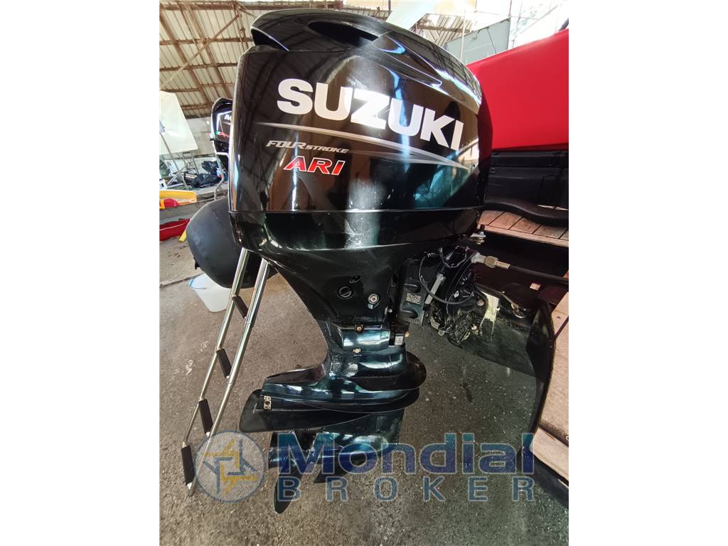 La console è dotata di volante, parabrezza con tientibene inox, strumentazione Suzuki (contagiri, trim, livello), display digitale, manetta laterale con cordino di sicurezza e predisposizione per ecoscandaglio/GPS. Presenti gavoni anteriori, gavone sotto seduta e panca posteriore con ulteriore spazio di stivaggio. Impianto elettrico funzionante, luci di navigazione, ganci di ormeggio e bitte.