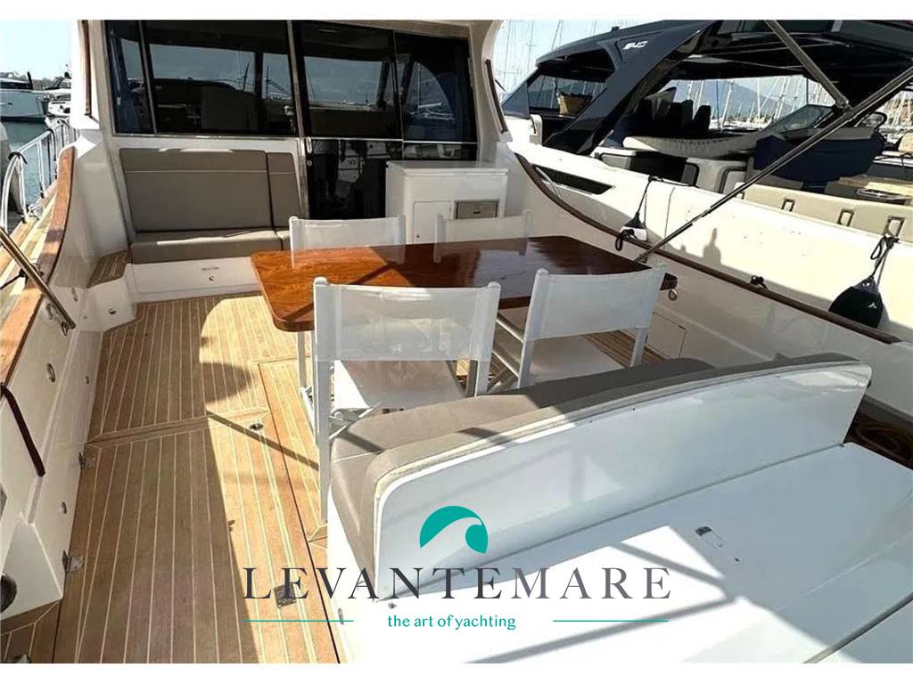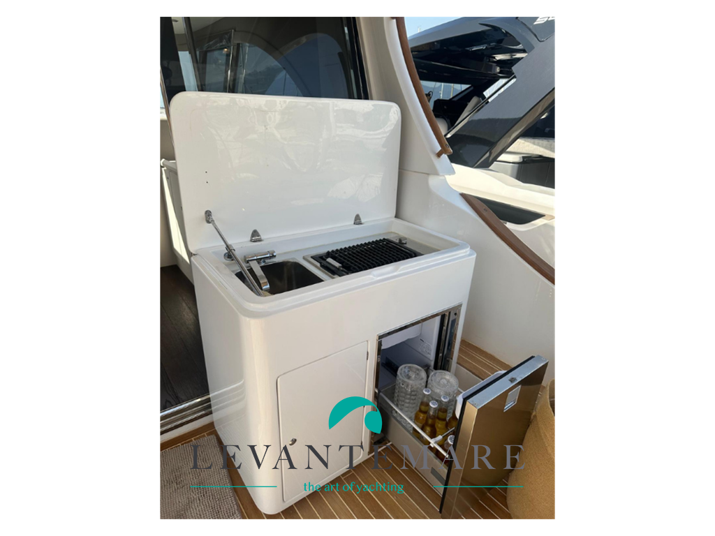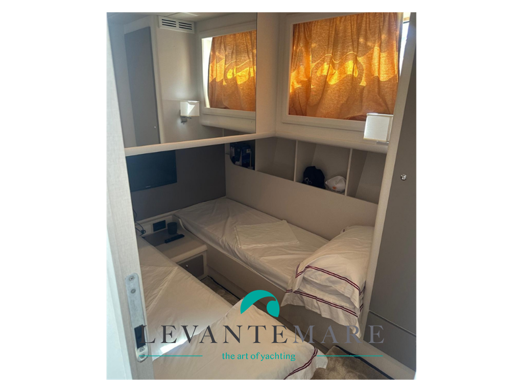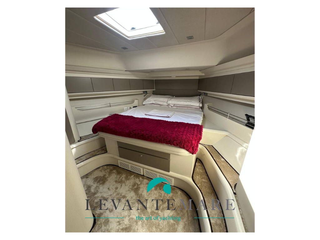 Salone con ampio divano a “С” сon tavolo centrale, mobile contenitore con TV a scomparsa; angolo cucina attrezzata con lavello inox a doppia vasca, piano cottura a 4 fuochi ad induzione, forno elettrico e frigorifero. Consolle di guida con plancia completa di strumentazione nuova. Cabina armatoriale matrimoniale con bagno con box doccia separato; cabina ospiti con letti singoli separati in piano; bagno ospiti con box doccia separato. Ampio pozzetto con comoda divano e tavolo a sei posti. Mobile con piastra barbecue e frigo. Accesso alla cabina equipaggio, attrezzata completa di servizi igienici.