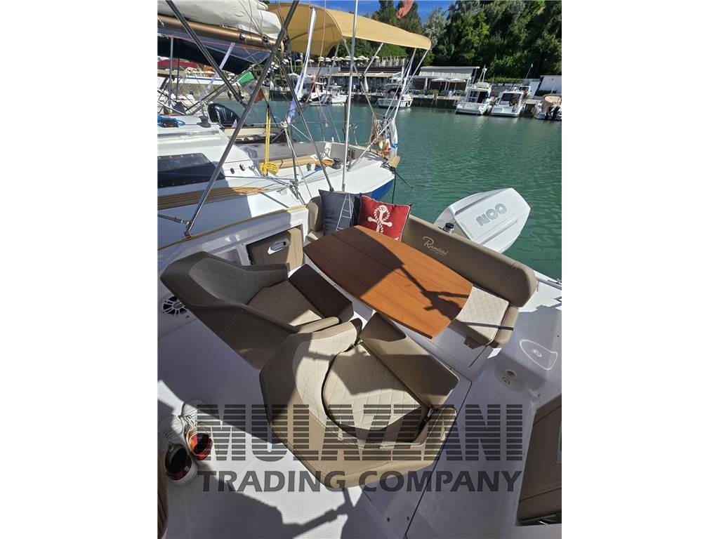 Altoparlanti, Copripozzetto (ombreggiante traforato laterali 2024), Copriscafo, Cuscineria completa, Cuscineria di prua, Cuscineria Pozzetto, Estintore, Frigorifero interno (30l), Giubbetti di salvataggio, Prese interne 12v, Radio AM/FM (Fusion MS RA70N), Razzi di segnalazione, Salvagente anulare con cima munita di boetta luminosa, Tendalino, WC marino elettrico, Tapezzeria Luxory