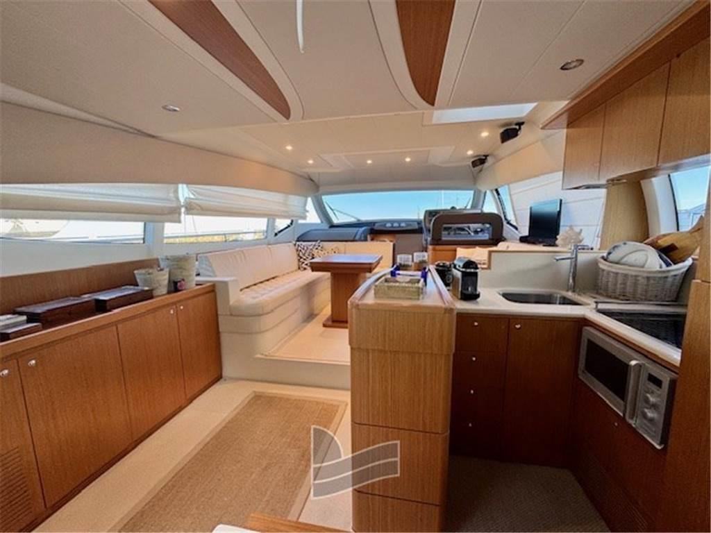 lo spostamento della cucina da centro barca a poppa crea un unico open space che include salone, cucina, dining area e pozzetto, senza interruzione di continuità grazie alla finestra basculante. La sky lounge senza roll bar e la presenza di uno spoiler esibiscono una linea sportiva, ma di grande eleganza.