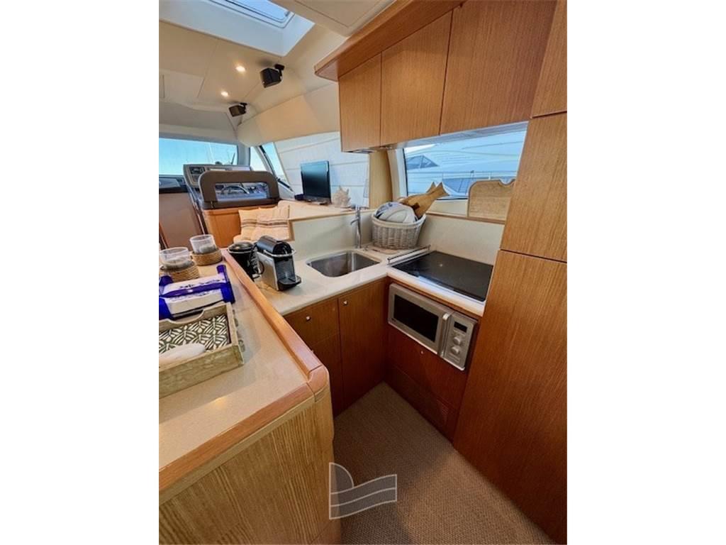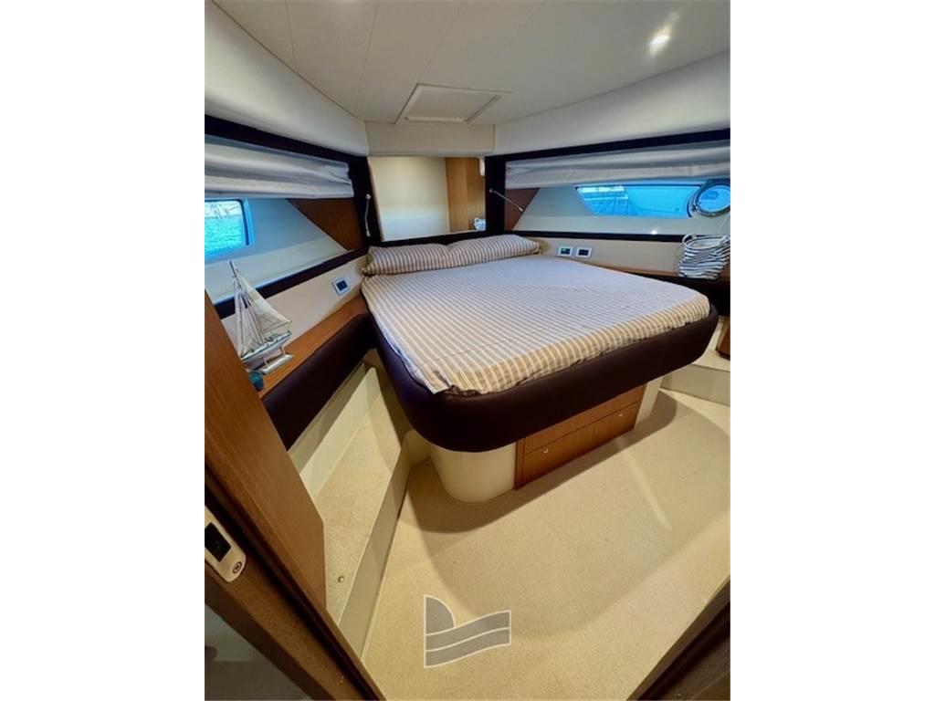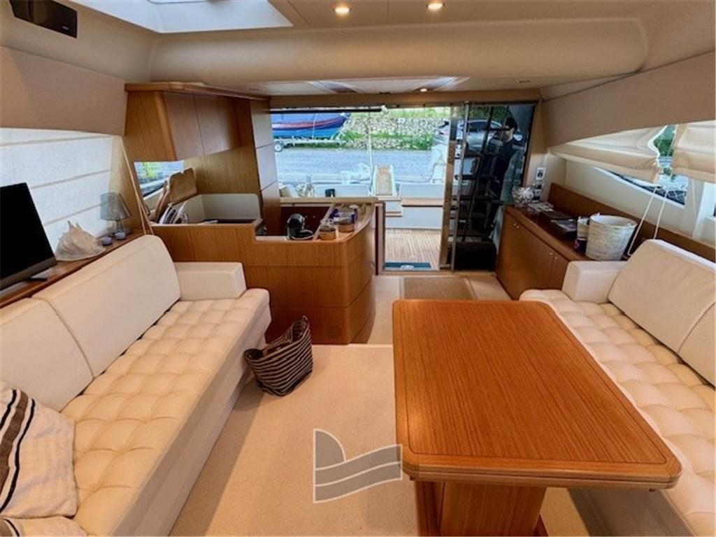Salendo a bordo, a destra si trova la cucina perfettamente attrezzata e posizionata a poppa e pensata per un armatore che vive la barca in prima persona. A sinistra comodo mobile contenitore con ante e sempre a sinistra un ampio divano ad angolo, molto profondo e dotato di tavolo alto allungabile, che permette di accomodare fino a 6 persone; a proravia della cucina si trova un altro divano con doppia seduta, la zona notte presenta soluzioni normalmente adottate per imbarcazioni di dimensioni maggiori, con tre cabine doppie, due con letto matrimoniale ed una con due letti singoli.