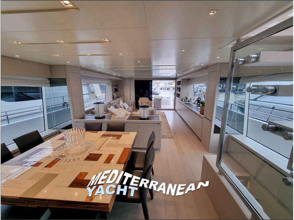 - Salone con divano a "L", tavolo basso e mobile contenitore contrapposto; zona pranzo con tavolo e otto sedie; disimpegno con scala salita al fly, scala discesa al ponte cabine e porta di uscita sul camminamento laterale SX.