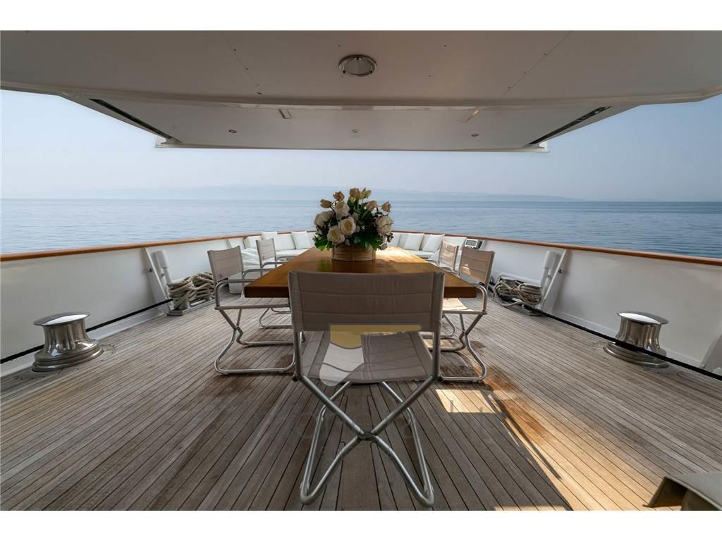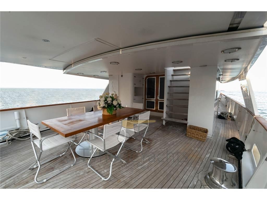 Camminamenti laterali in teak, Doccia esterna, Elica di prua - bow thruster (electric 60KW), 2 Gruette per tender su fly, Impianto antincendio, Lavaggio catena, Luci di cortesia, Passerella, Porta laterale, Pozzetto Teak, Presa 220V banchina, Presa acqua banchina, Scala reale, Sistema Depurazione acque nere, Stabilizzatori, Tavolo pozzetto, 2 Tender, Tromba, Winch tonneggio di poppa, Winch tonneggio di prua.