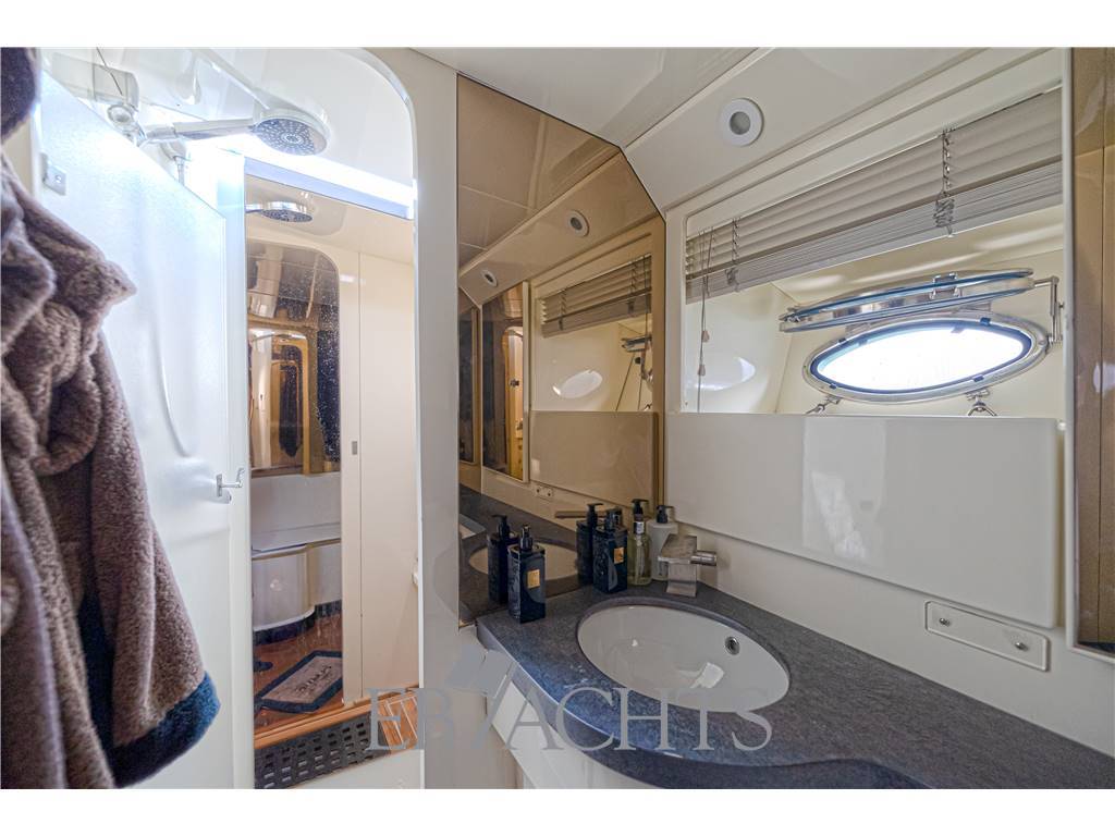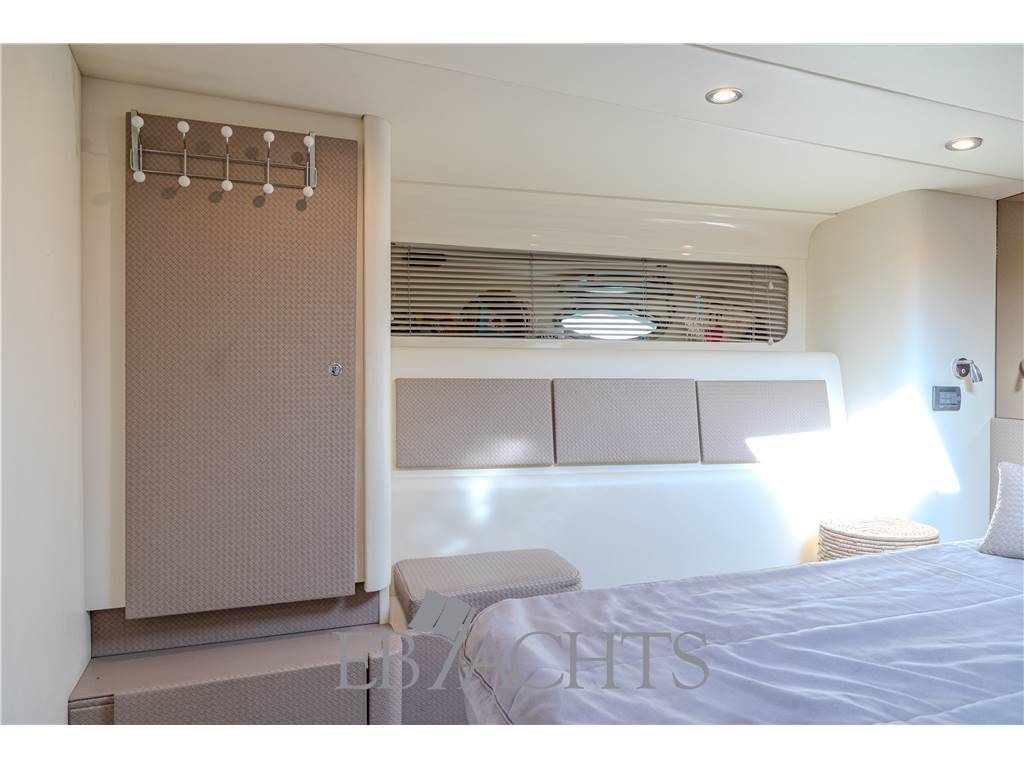 Pozzetto ridisegnato con sedute profonde e tavolo in cristallo fumé, accesso a prua agevolato da un’apertura centrale nel parabrezza, prendisole poppiero con passaggio centrale e coperta in teak con prendisole circolare. Sottocoperta, un raffinato open-space ospita cucina con penisola, divano, cabina armatoriale di design e una nursery convertibile. A poppa con accesso separato troviamo la cabina ospiti con bagno.