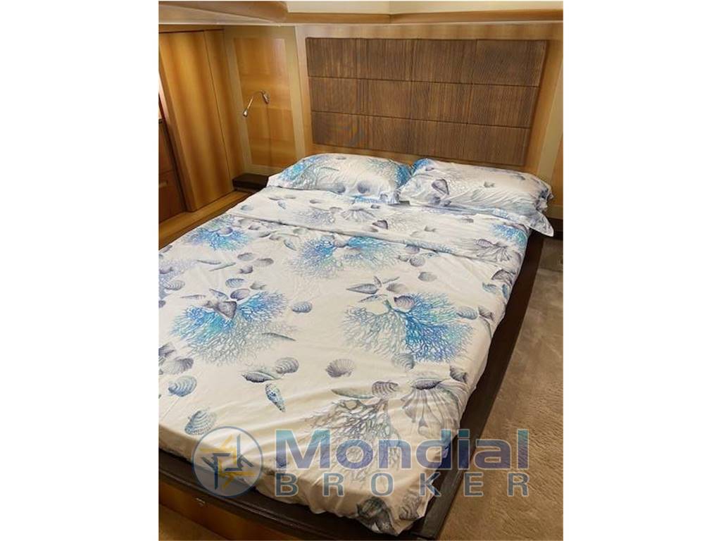 Gps + radar, ecoscandaglio, pilota automatico, bussola + VHF, dispositivo ricovero tender + verricello tender, winch a poppa, parallelo, LCD cabina prua, radiostereo, frigo + congelatore + mobile bar, forno a microonde, LCD dinette, boiler, antenna TV, presa banchina + cavo, salpa ancora con doppi comandi, caricabatteria, faro orientabile, pompe di sentina automatiche, piano cottura pozzetto, piano cucina in dinette, luci sommerse, 2° frigo pozzetto, lettore CD, impianto 220 Volt, contacatena, autoclave, LCD a scomparsa in pozzetto, pozzetto in teak, copripozzetto + copricruscotto, passerella idraulica a scomparsa, capottina completa, aria condizionata, plancetta di poppa allungata, flaps + indicatori, generatore Mase IS9.