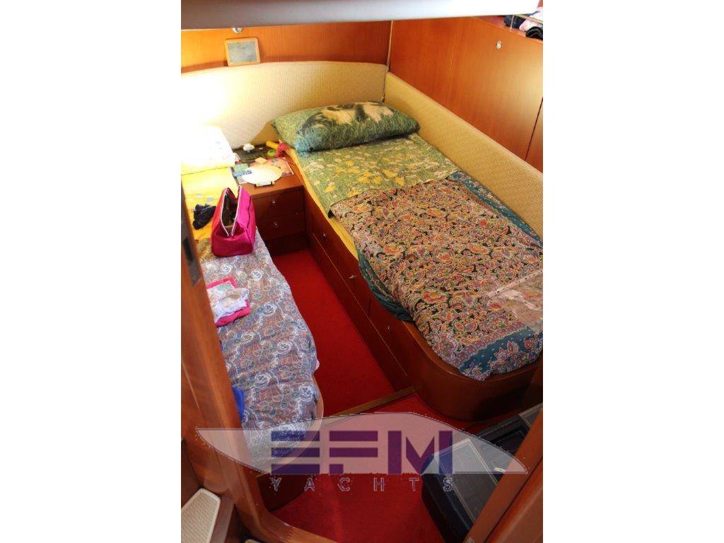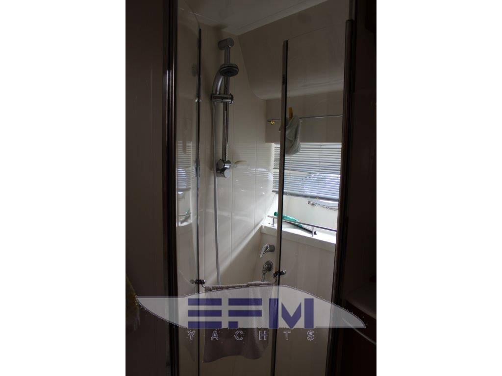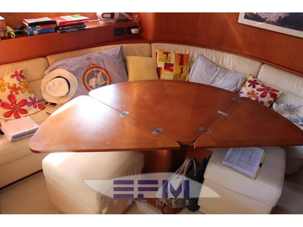 Suddivisione e caratteristiche: cabina a prua con matrimoniale, armadio, bagno privato con box doccia , bagno di servizio a poppa via dotato di doppio accesso, cabina ospiti a poppavia con due letti affiancati e armadio e bagno con doccia, salone con dinette trasformabile e zona cottura a dritta , terza cabina VIP a poppa via con letto alla francese e armadio e bagno privato - Ebanistica in noce tanganica con finiture satinate, tappezzerie e rivestimenti in tessuti a scelta