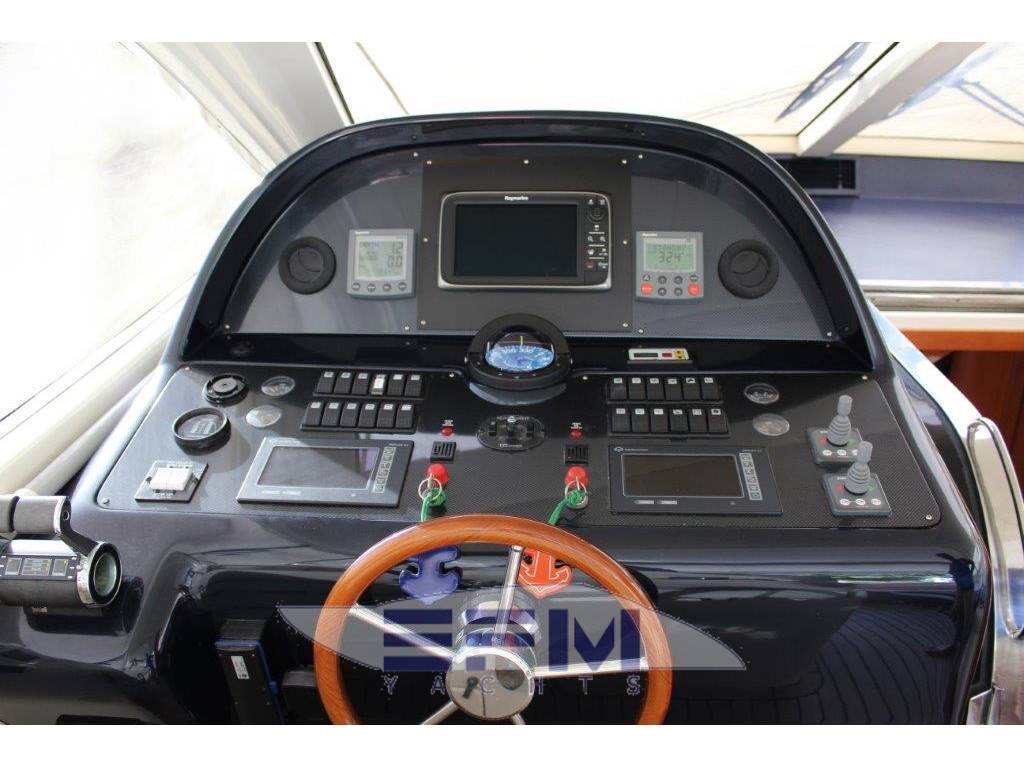 Posto di pilotaggio in pozzetto: con seduta pilota e copilota a divaneria, timoneria a ruota idraulica, telecomandi, strumentazioni e indicatori completi motori, bussola, VHF, tridata log, GPS plotter