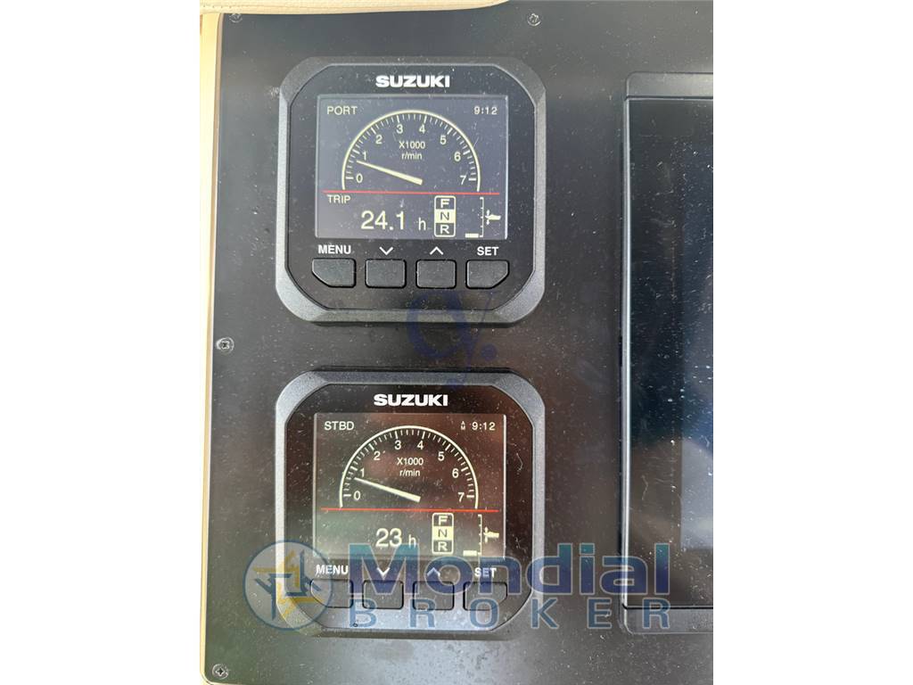 Bussola - Comando motori elettronico (Suzuki) - Elettronica Garmin Computer di bordo - Contamiglia - Display 16” - Ecoscandaglio - Elica di prua/ bow thruster - GPS- Log - Plotter con antenna GPS - Radio VHF - Salpa Ancore Elettric.