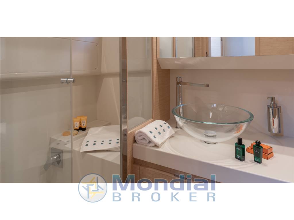 Bagno con doccia separata, tanti stipetti dove ritirare qualsiasi cosa, tanta luce e un’ottima ventilazione garantita sia dal grande passauomo che dagli oblò laterali e da un potente condizionatore.