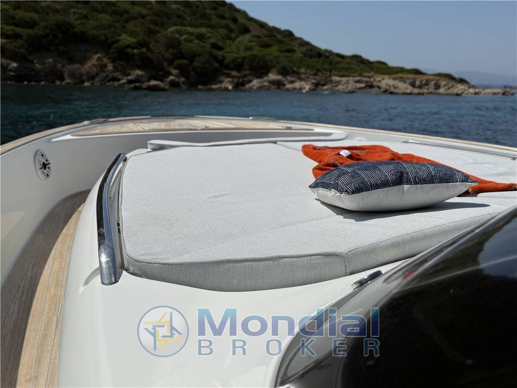 Antivegetativa colore nero; coperta in teak con comento grigio; terrazze laterali apribili con rivestimento in teak; Spiaggetta di poppa lunga con sistema idraulico sali e scendi compresa scaletta di discesa automatica; Luci subacquee (n. 4); Tavolo pieghevole in pozzetto; prendisole di poppa con panca separata, apertura elettrica e cuscineria; 2 frigoriferi addizionali sotte le sedute pozzetto; Icemaker cucina pozzetto; BBQ in vetroceramica (220V); tappezzeria esterna in Sumbrella light grey; portabicchieri prendisole poppa e prua (4); portabicchieri sedili guida (2); Oblò apribile a prua; Ancora inox 16Kg con snodo; Cancelletti di poppa in acciaio inox; Asta inox portaparabordi gavone di prua;